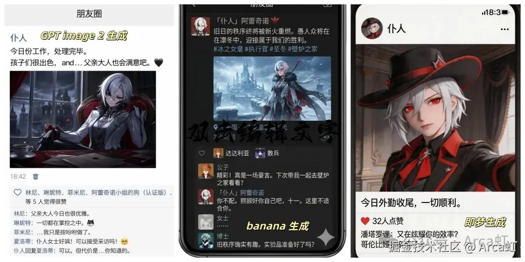 首先让它生成了《原神》中仆人的朋友圈。下面是三个平台生成的对比,效果太明显了,GPT image 2 遥遥领先。然后让它做了对小说大纲的解读,是笔者用之然偶然的灵感让 AI 生成的一个大纲文本,并没有仔细的去看,下图是其生成的结果。