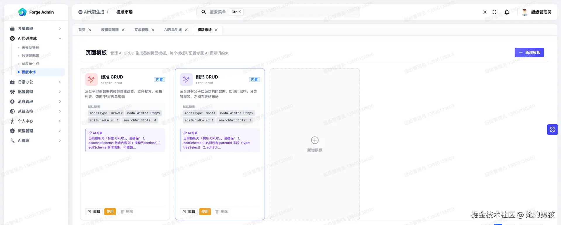 这不是低代码平台的画饼,也不是代码生成器的老套路。今天介绍的是 Forge Admin 最新上线的 AI 代码生成功能 —— 一个真正让你 0 代码出活,还能 定制个性化业务模板 的新玩法。