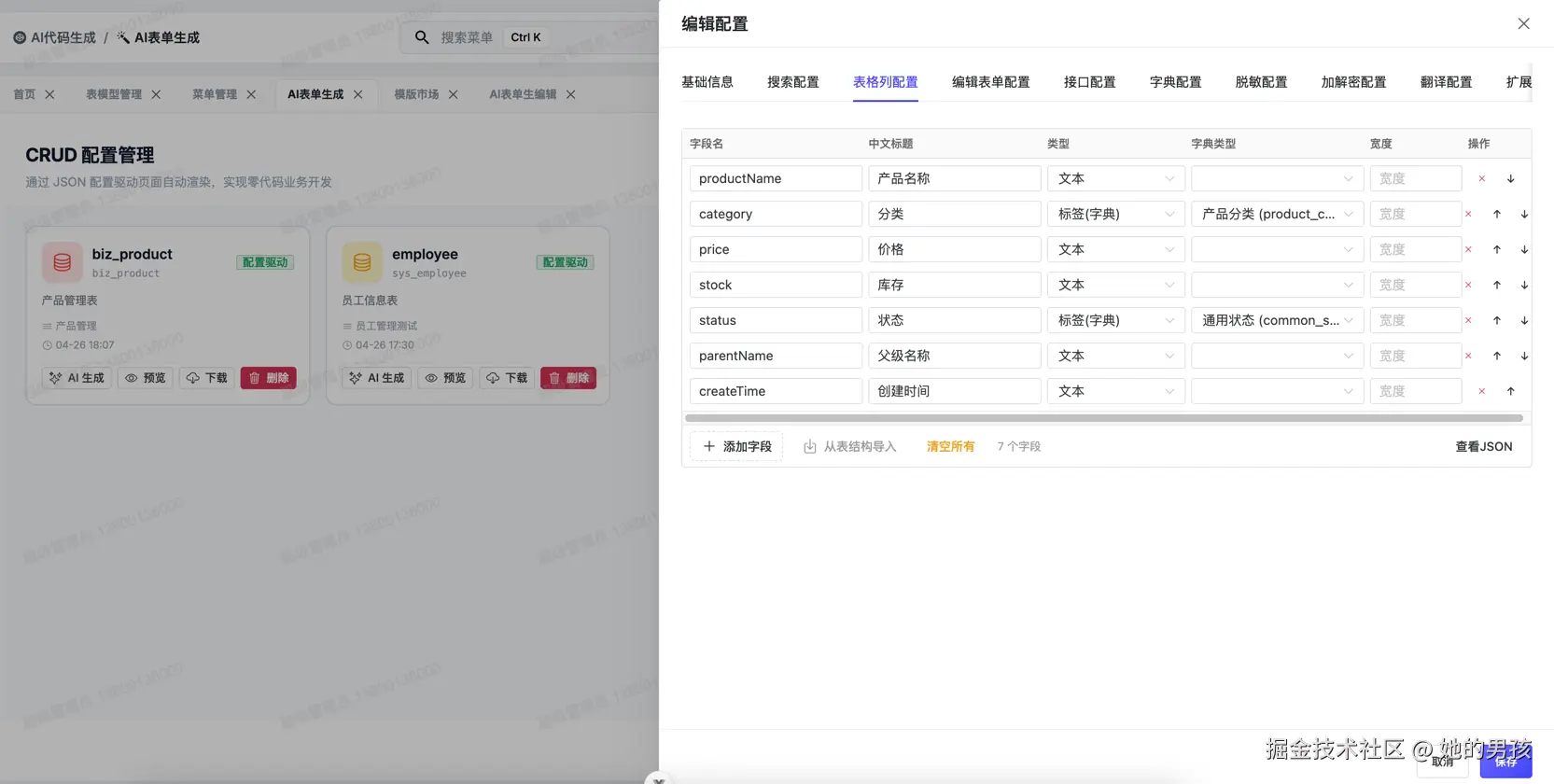 不需要你写任何代码。只需要在界面上配置业务参数,AI 就会根据你选择的模板,自动生成完整的业务模块代码。