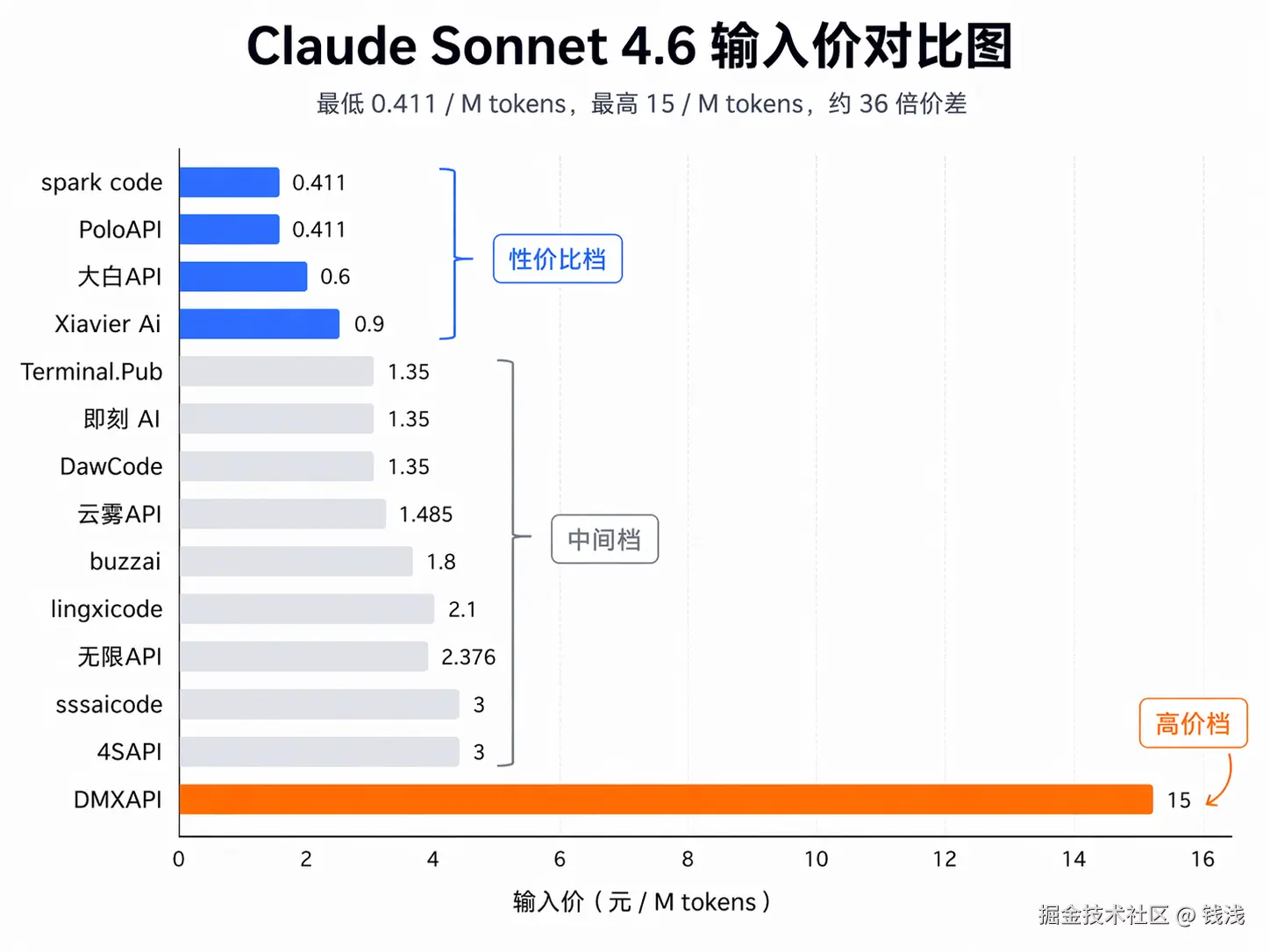 结果在 14家中转站里,最低输入价 0.411 / M tokens,最高 15 / M tokens,差了差不多 36 倍!!!