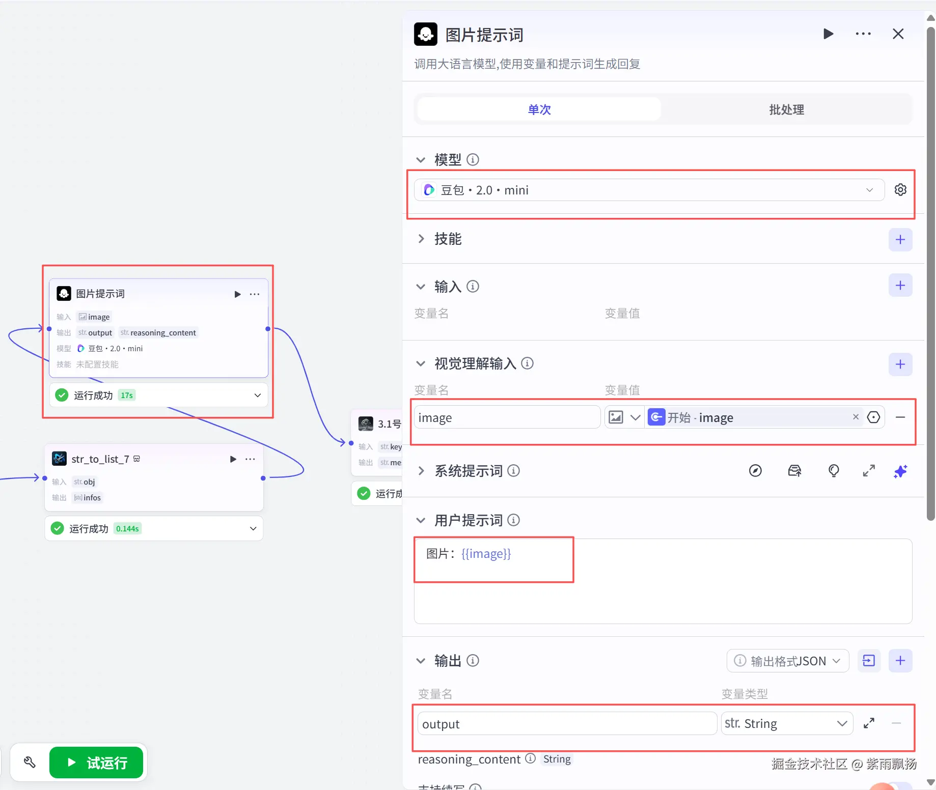 在字符转列表后添加一个扣子官方的 【大模型】节点->设置参数及提示词;
