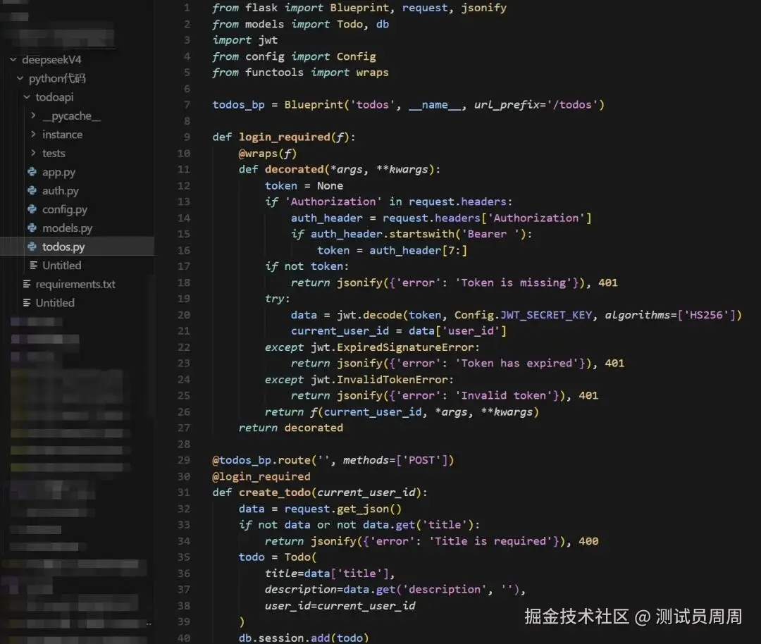 输入:"用 Python + Flask 实现一个待办事项 API,包含用户注册、登录、CRUD 操作。写单元测试,覆盖率 80% 以上。"