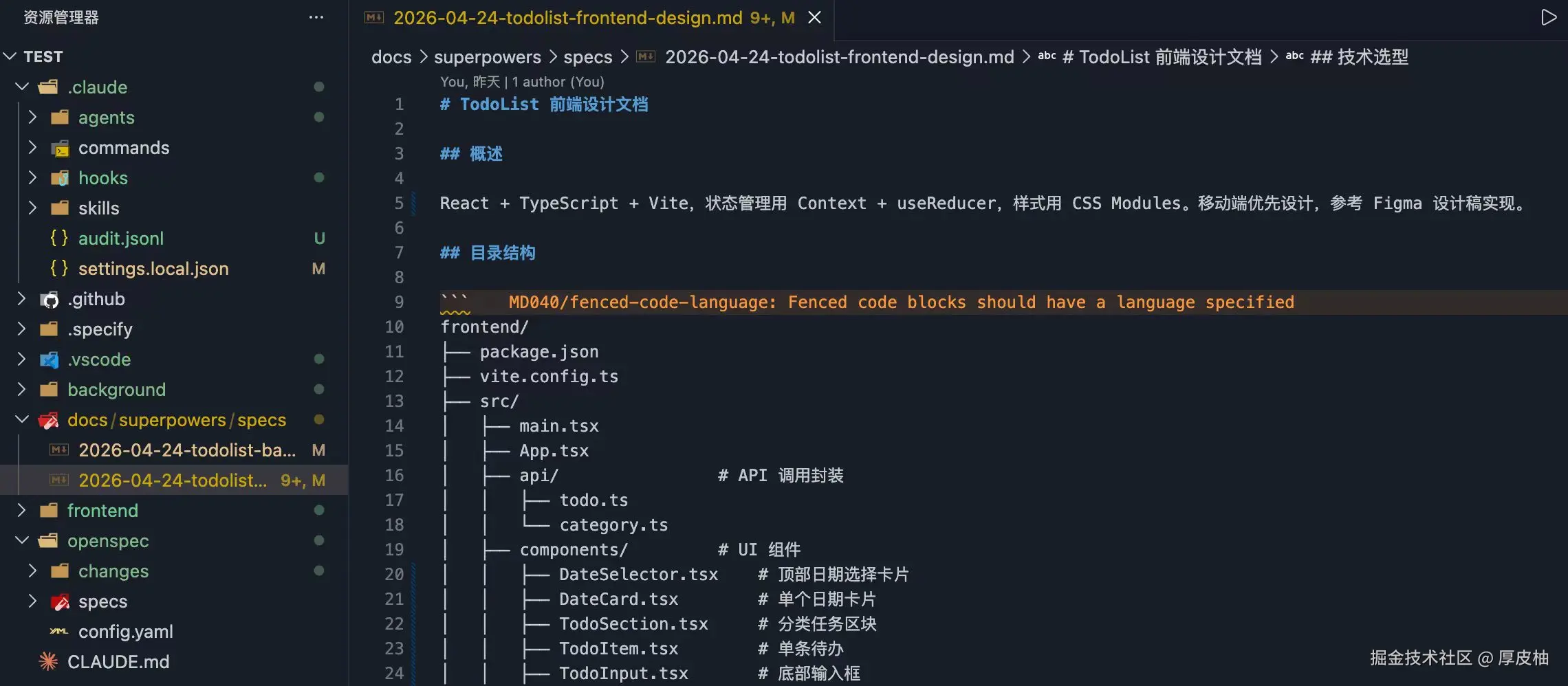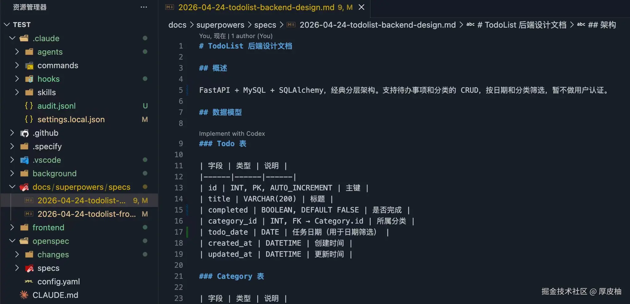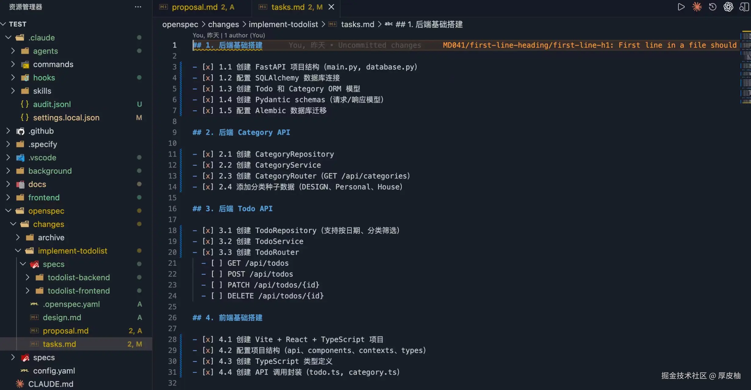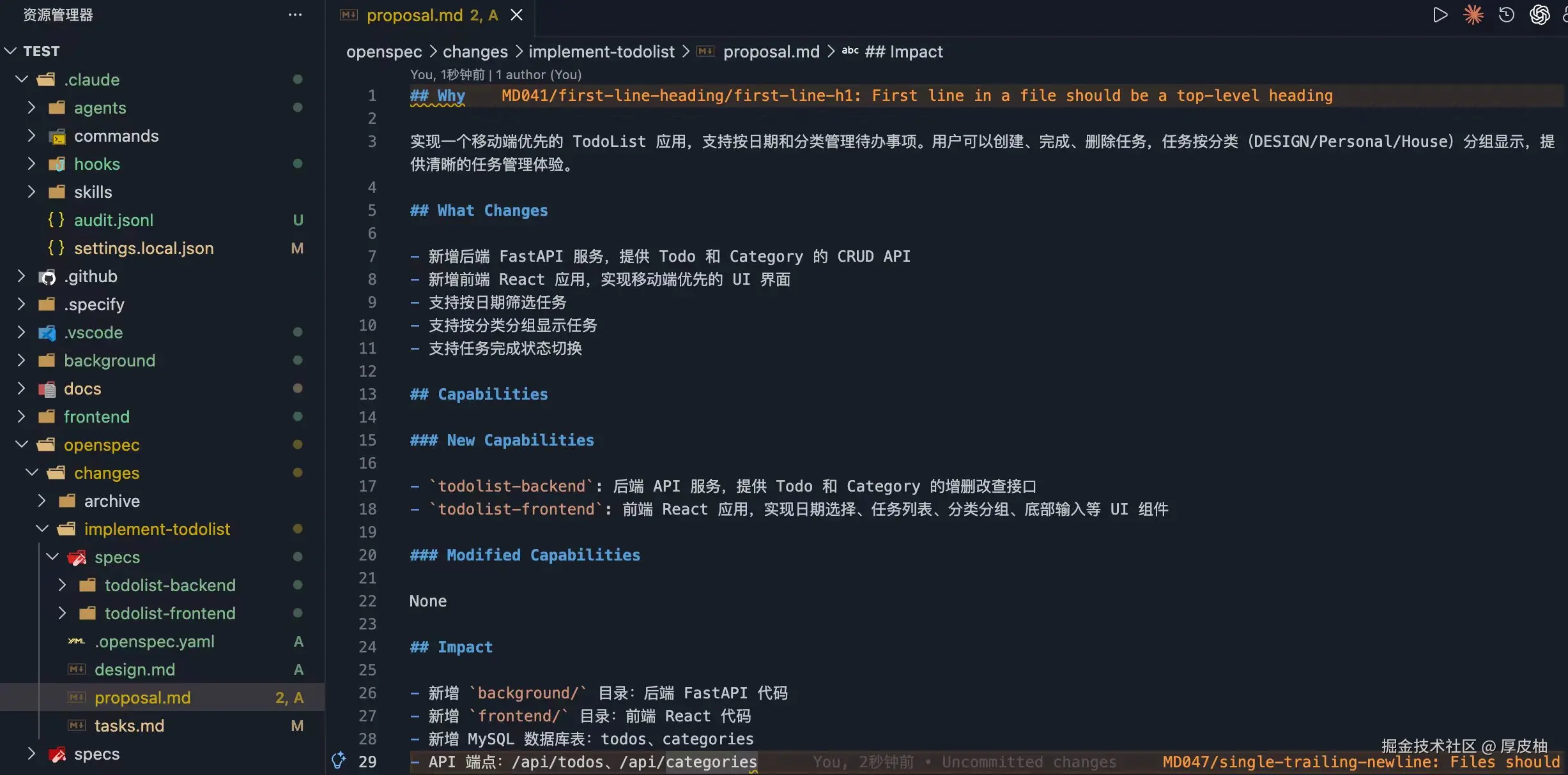 脑爆阶段的想法比较发散,当进入执行时,需要使用 openSpec 收敛并固化,固化的顺序是:proposal(做什么/为什么)--> design(怎么做)--> tasks(怎么落地)