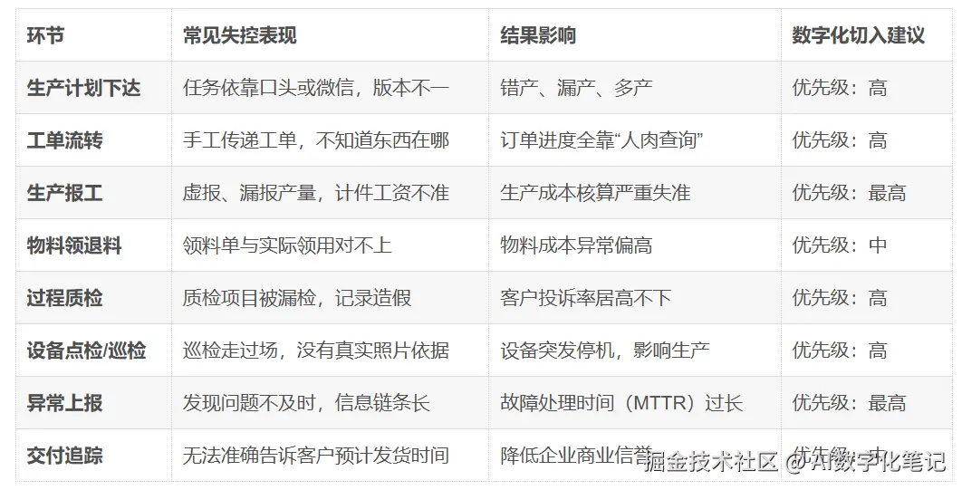 识别失控点是实现制造业数字化的第一步。下表拆解了 8 个关键环节的常见风险及数字化价值: