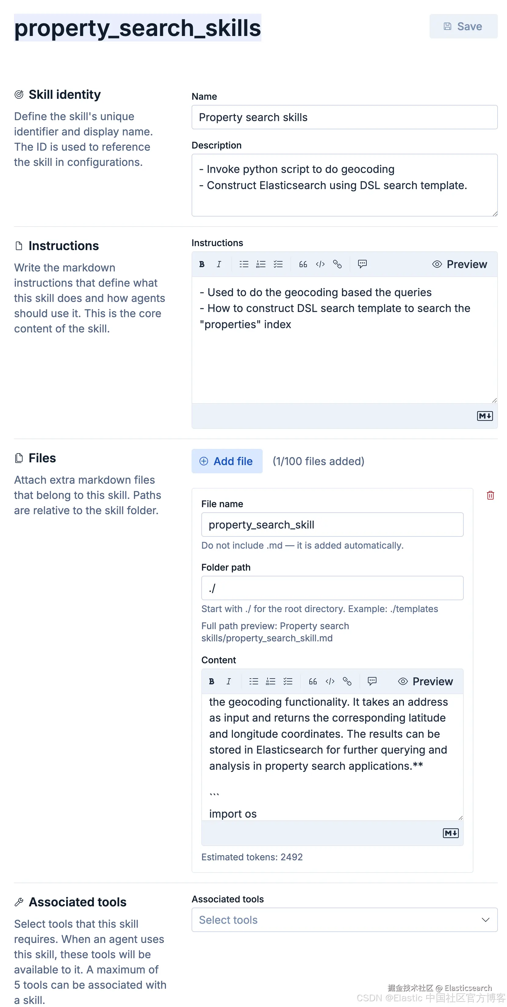 - 我们使用 AI Builder,Workflow 及 Skills 来共同完成。我们使用 geocoding workflow 来完成地理位置的获取,详细的实现请参阅文章 “Elasticsearch:智能搜索 - AI builder,workflow 及 skills”。