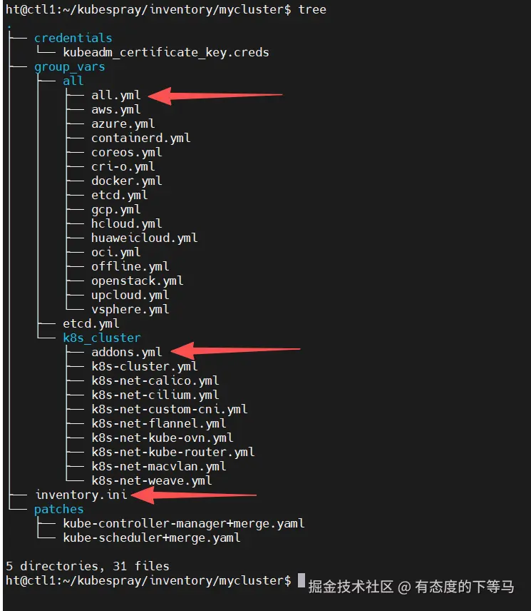 cp -rfp inventory/sample inventory/mycluster, 你即将创建的k8s集群蓝图名为mycluster.