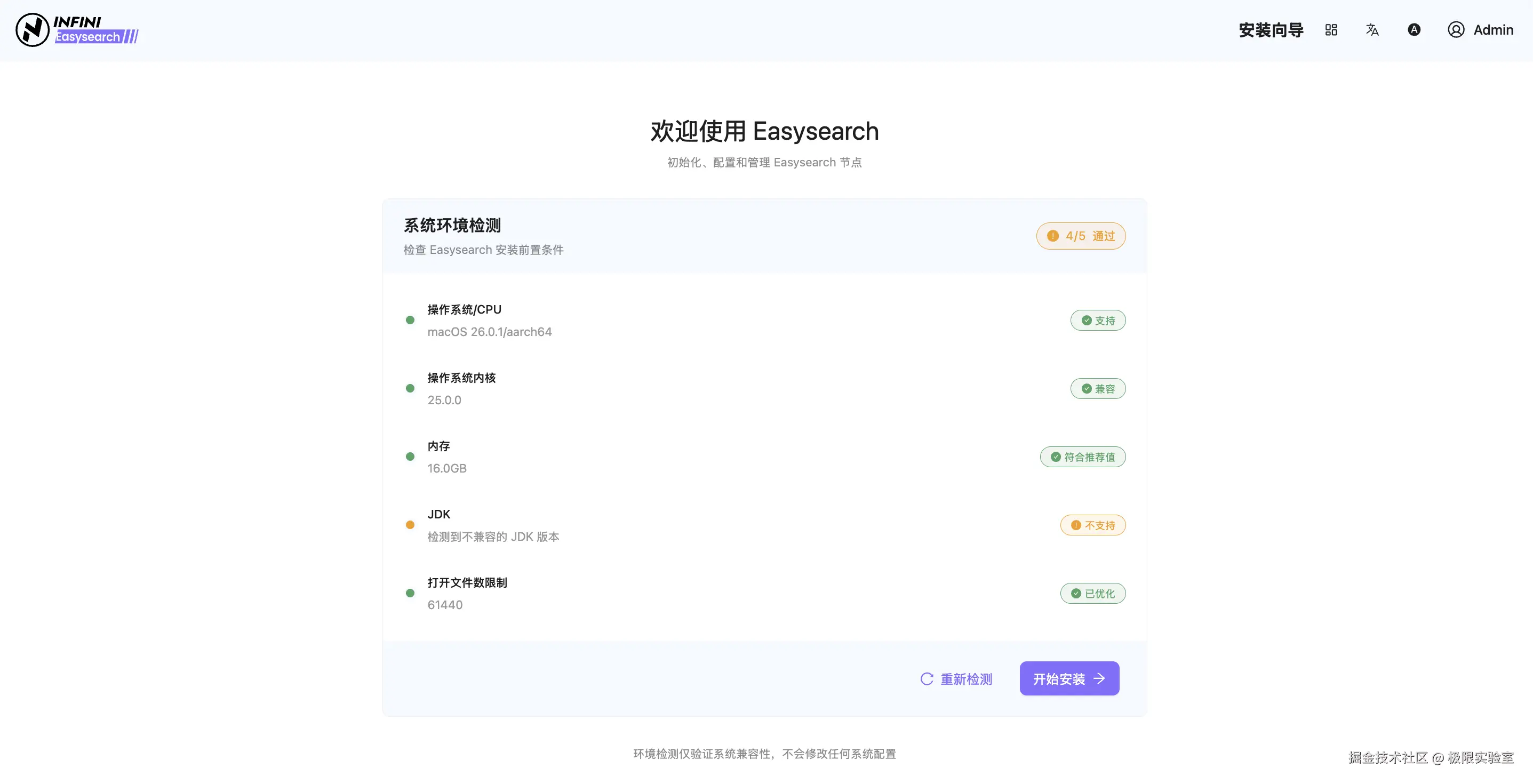 向导在开始安装前会对当前机器进行全面检测,帮助用户提前发现潜在问题: