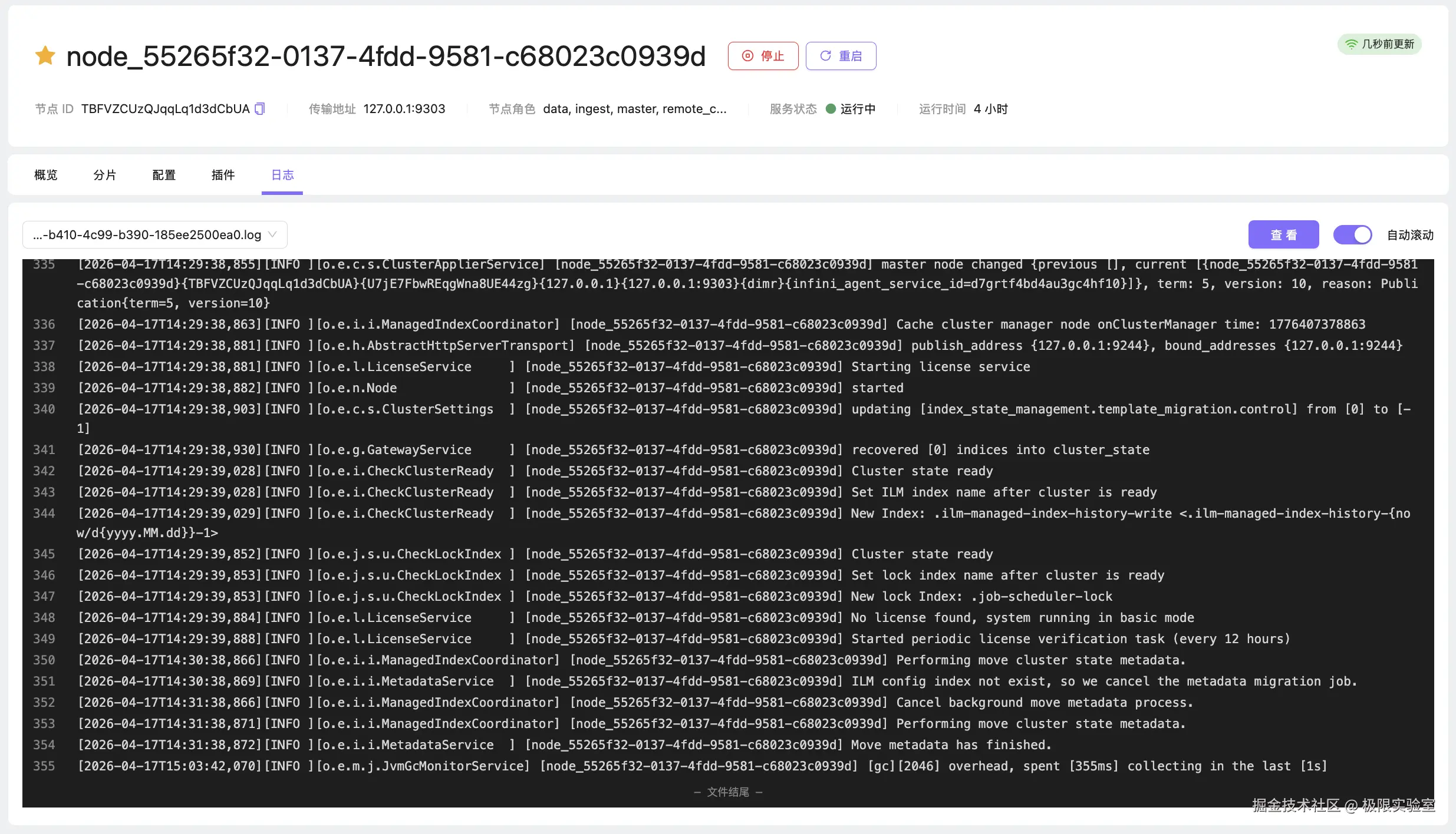 - 在线日志排查:内置日志阅读器,支持查看节点日志文件列表,并提供类似 tail -f 的自动滚动功能,无需登录服务器即可快速定位报错。”