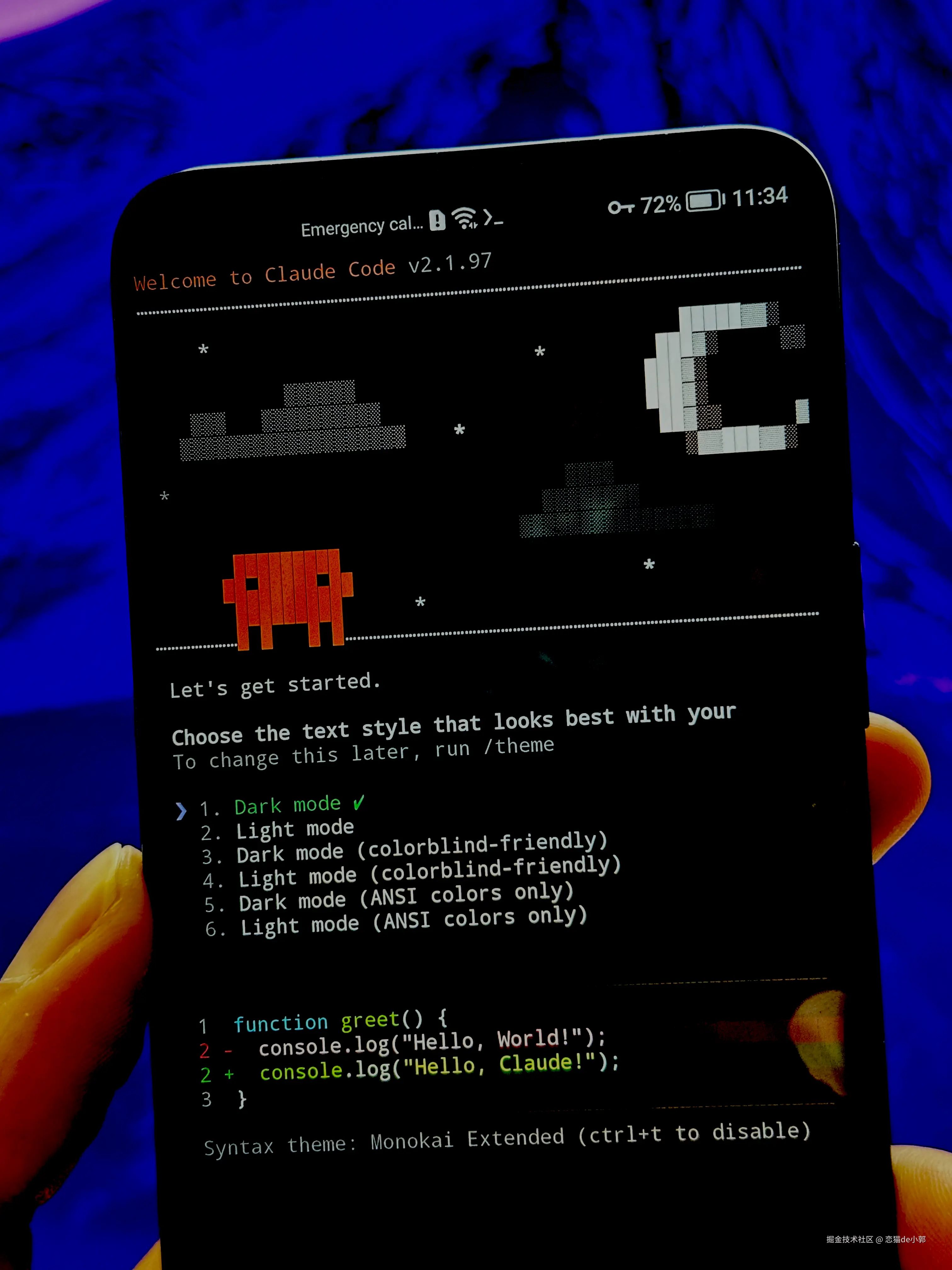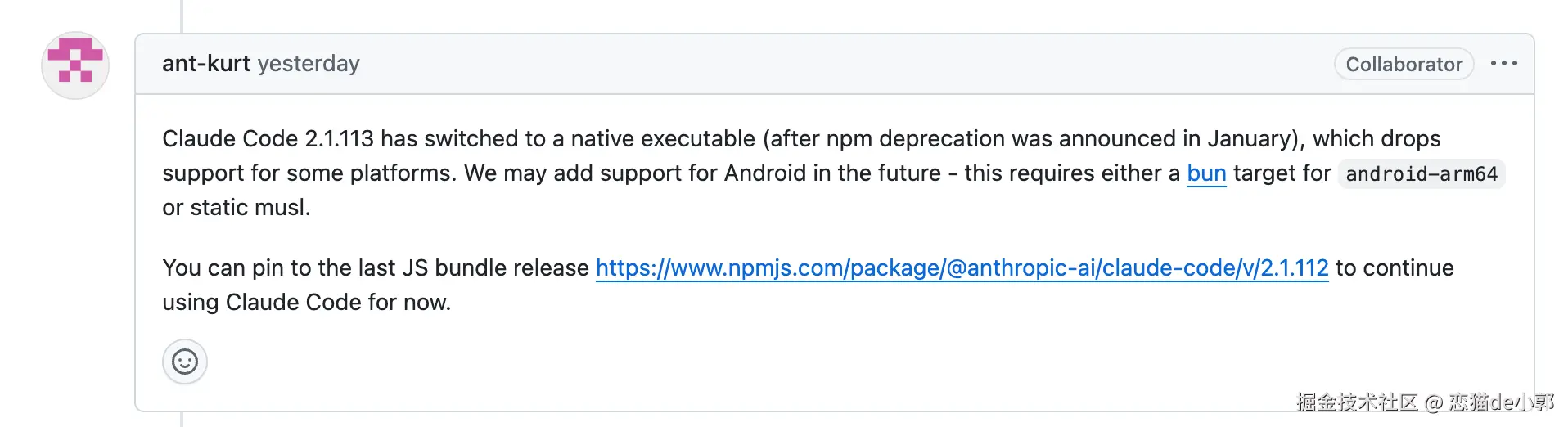 另外,Claude Code 从 v2.1.113 版本开始就切换到原生可执行二进制,不再是纯 Node.js,这样导致之前 Node.js 的 Termux/Android 上支持 Claude Code 无法正常工作: