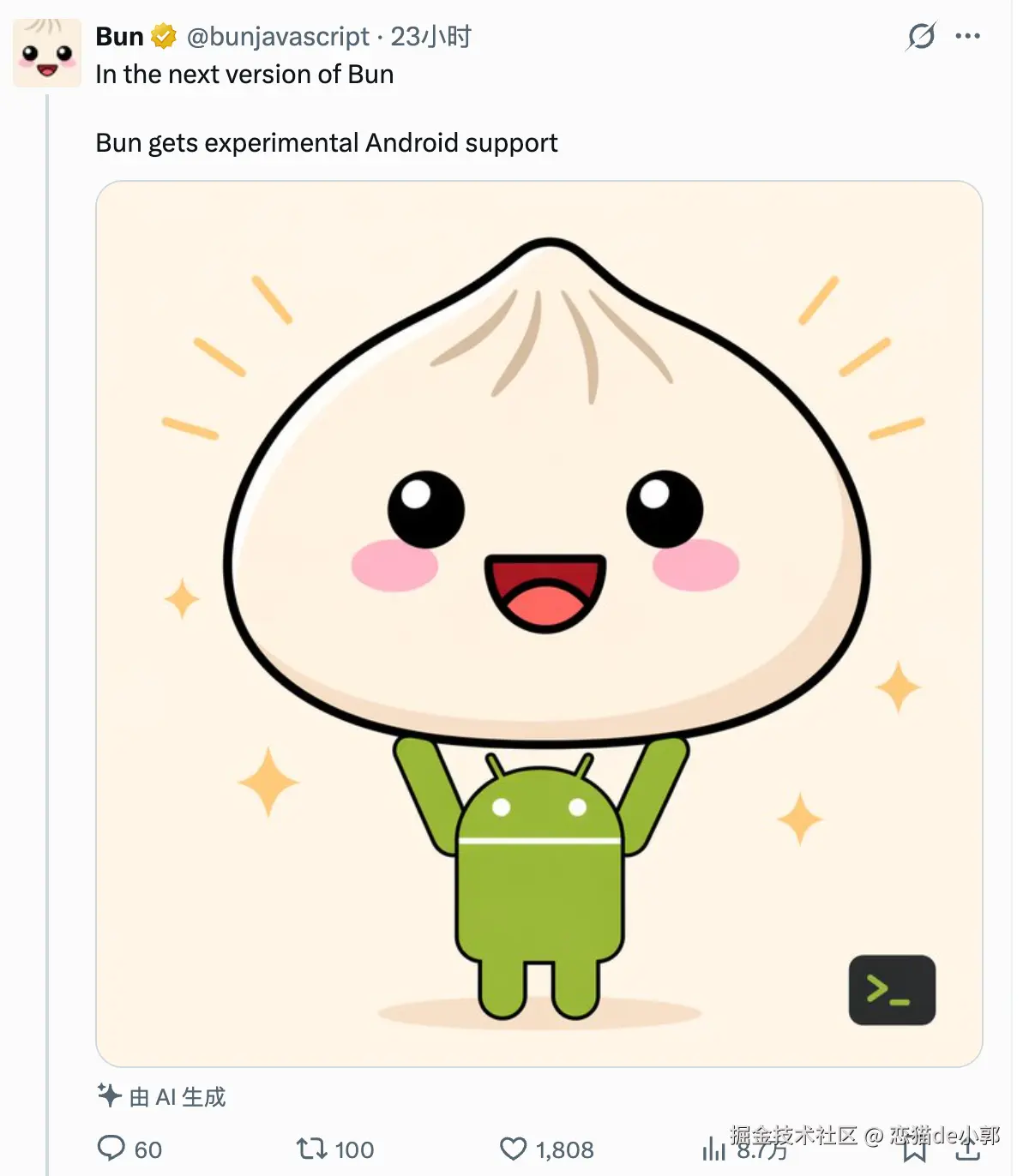 最近 Bun 官方正式宣布,下个版本 Bun 将正式支持 Android ,当然官方也说了,不要别把「能在 Android 手机上跑 Bun」误解成「能用 Bun 开发 Android App」,用 Bun 开发 Android App 毫无意义,它的定位更多是和 Node.js 的 Android 支持类似,本质是官方把 Bun 这个 JS 运行时移植到了 Android 平台。