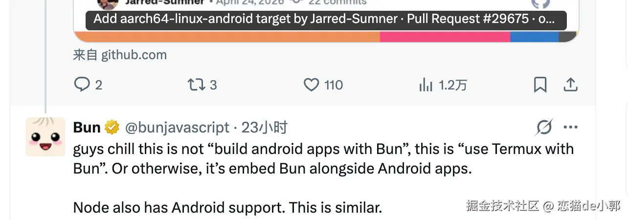 也就是,你可以在 Android 的 Termux 里直接装 Bun,然后在手机上跑各种 JS 项目了,包括 Claude Code ,因为 Bun 就是被 Anthropic 收购,而 Claude Code 现在就是基于 Bun 的 CLI Agent 。