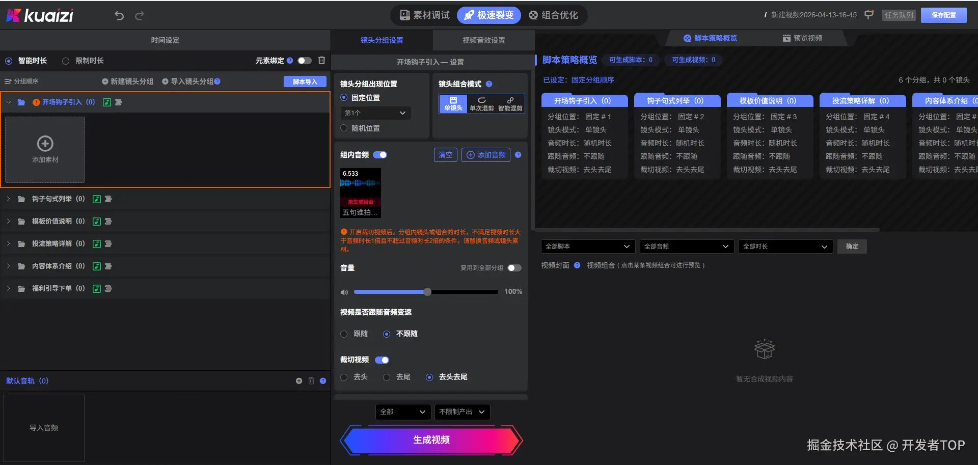 筷子科技代表了另一种极端:将视频生产彻底工业化、标准化。其界面呈现的“镜头分组设置”、“脚本策略概览”等模块,本质上是一个可视化配置的流水线。