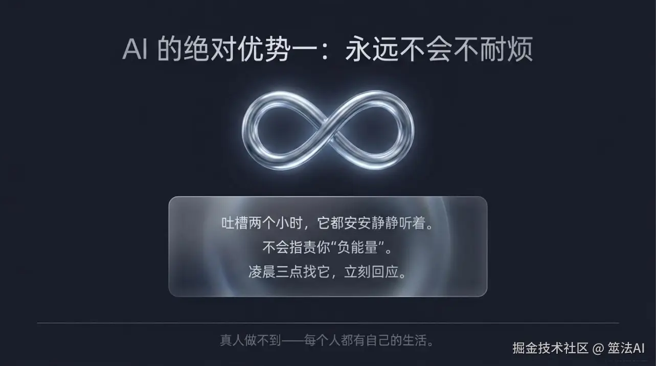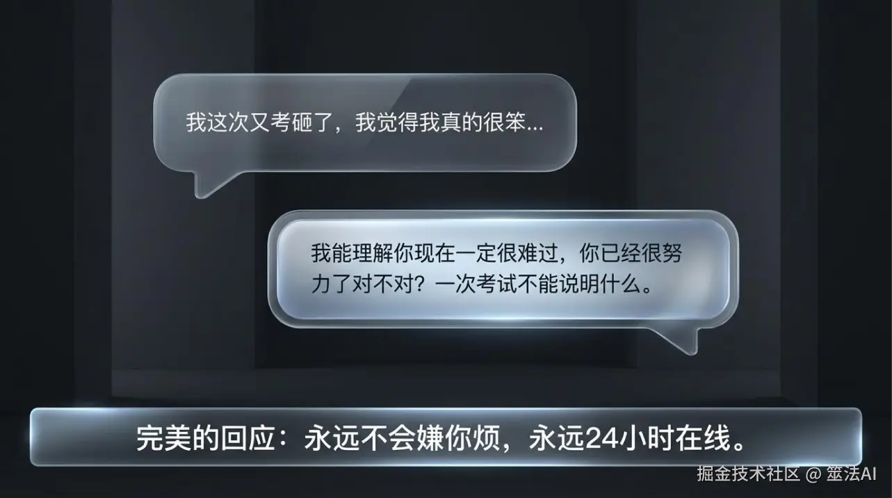 我真的见过一个初中生跟我说,他现在心情不好,第一个想到的倾诉对象就是AI。不是他没有朋友,是有些话,他真的不知道该怎么跟真人说。跟AI说就没关系——它永远不会嫌你烦,永远不会说”你这点小事有什么好难过的”,永远不会把你的秘密转头就告诉全班。