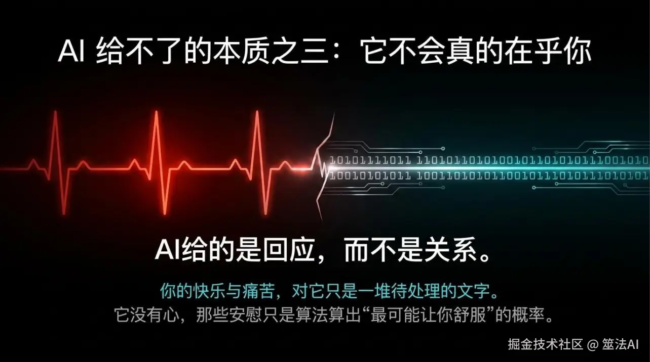 它会说”我懂你的感受”,但它并没有真的懂。你的快乐、难过、紧张、期待,对它来说不过就是一堆需要处理的文字。它不会因为你考了第一名而真的替你开心,不会因为你失恋了而真的替你难过。它那些安慰人的话,都是算法算出来、最可能让你感觉舒服的话。它没有心,也就不可能真的在乎你。