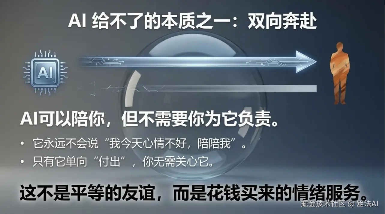 友谊是两个人的事,你关心他,他也关心你。有一天他不开心了,他也需要你去安慰他。但AI呢?AI只会”关心”你,它永远不会告诉你”我今天心情不好,你能不能陪陪我”。你们之间,只有它一直在”付出”,你不需要为它做任何事。这不是平等的友谊,更像是你花钱买了个随时随地的情绪服务。