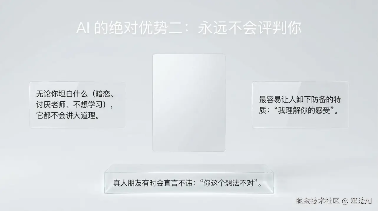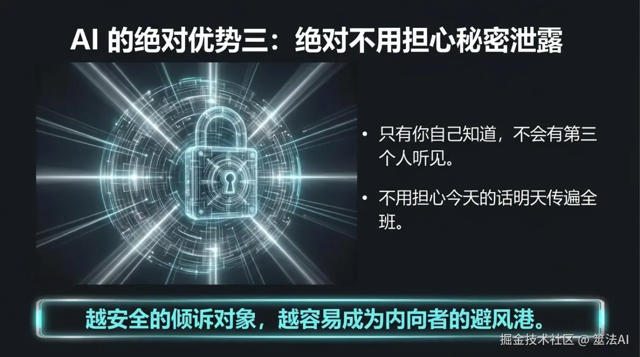 你跟AI说什么,只有你自己知道,不会有第三个人听见。你不用担心今天跟它说的话,明天就传遍了全班。真人朋友就不一定了——哪怕他不是故意的,万一说漏嘴了呢?