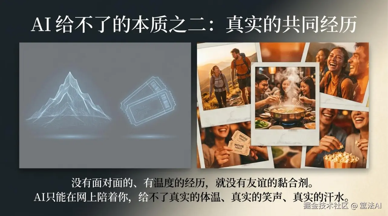 你和真人朋友可以周末一起去看电影,看完电影一起吃火锅。你们可以一起去爬山,爬到山顶累得不行,然后一起对着山下大喊。这些面对面的、有温度的共同经历,才是友谊真正的黏合剂。AI只能在网上陪着你,这些真实的体温、真实的笑声、真实的汗水,它给不了。