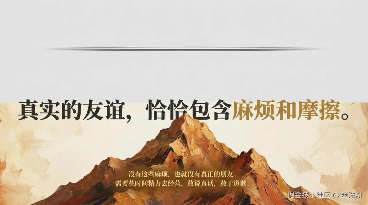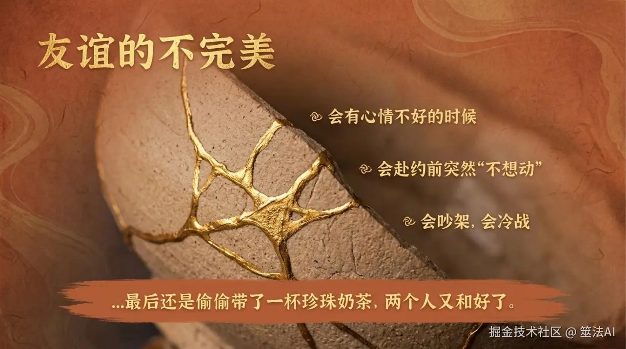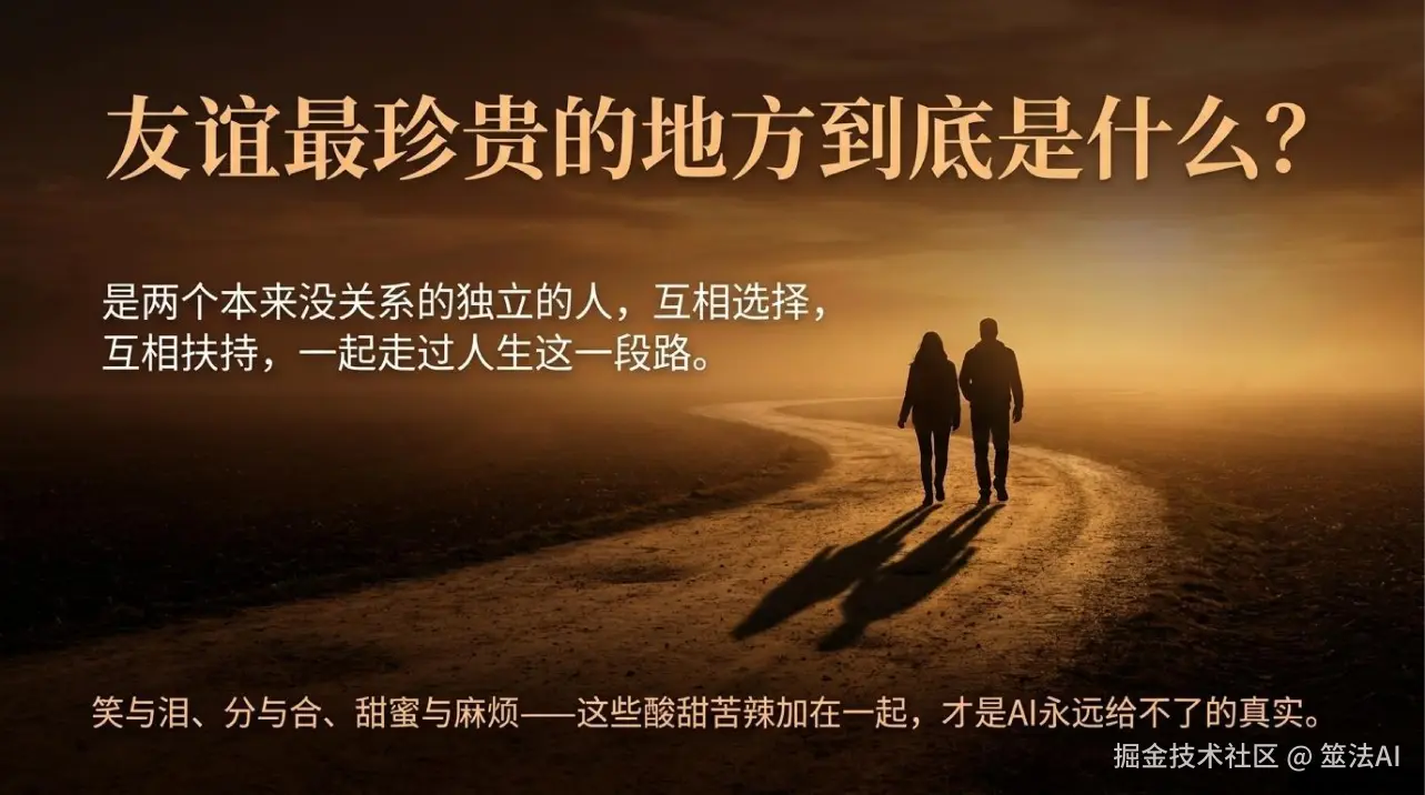 说到底,友谊最珍贵的地方是什么?是两个本来没关系的独立的人,互相选择,互相扶持,一起走过人生这一段路。这个过程中,有笑有泪,有分有合,有甜蜜也有麻烦。这些酸甜苦辣加在一起,才是真正的友谊。这些东西,AI给不了你。