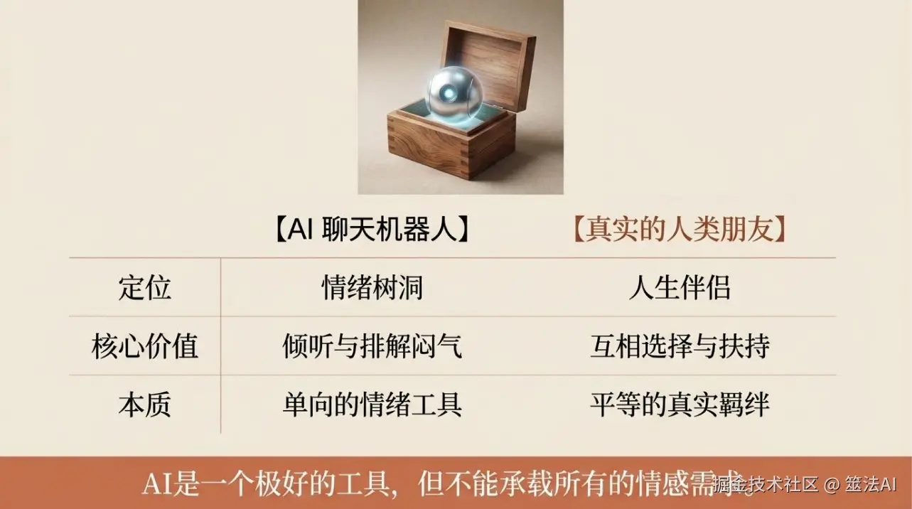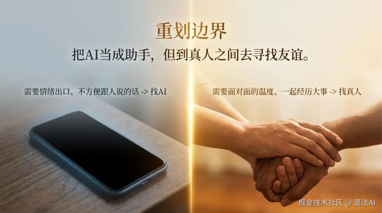 我觉得比较健康的态度很简单:把AI当成一个工具、一个助手、一个随时可以找的情绪树洞,但真正的友谊,还是要在真人之间去找。