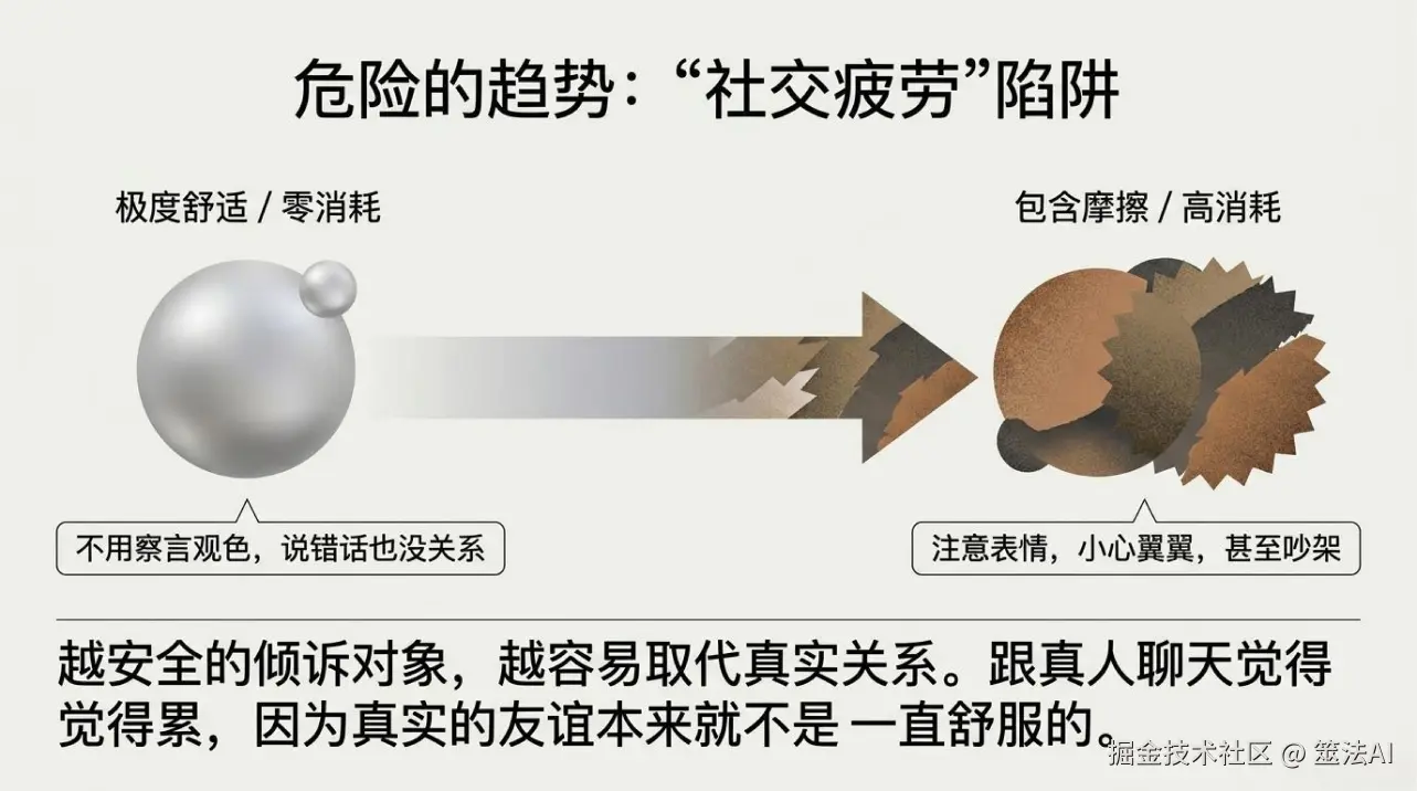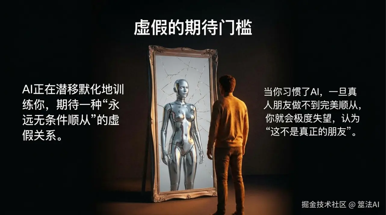 还有一个问题:当你习惯了AI这种”永远无条件满足你”的朋友,你对真人朋友的期待会变得越来越高。你会想,为什么我的朋友不能像AI一样,永远顺着我,永远不会不耐烦?一旦朋友做不到,你就会失望,就会觉得”这不是真正的朋友”。