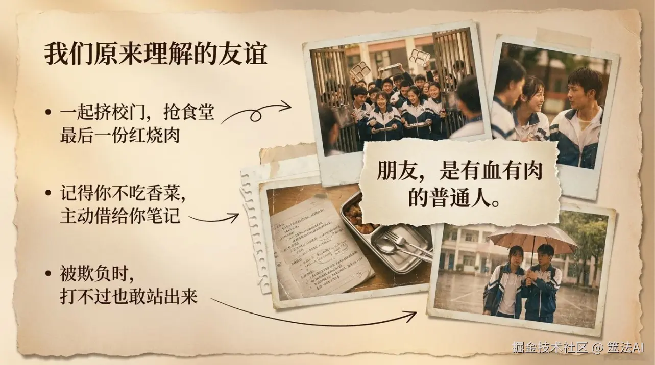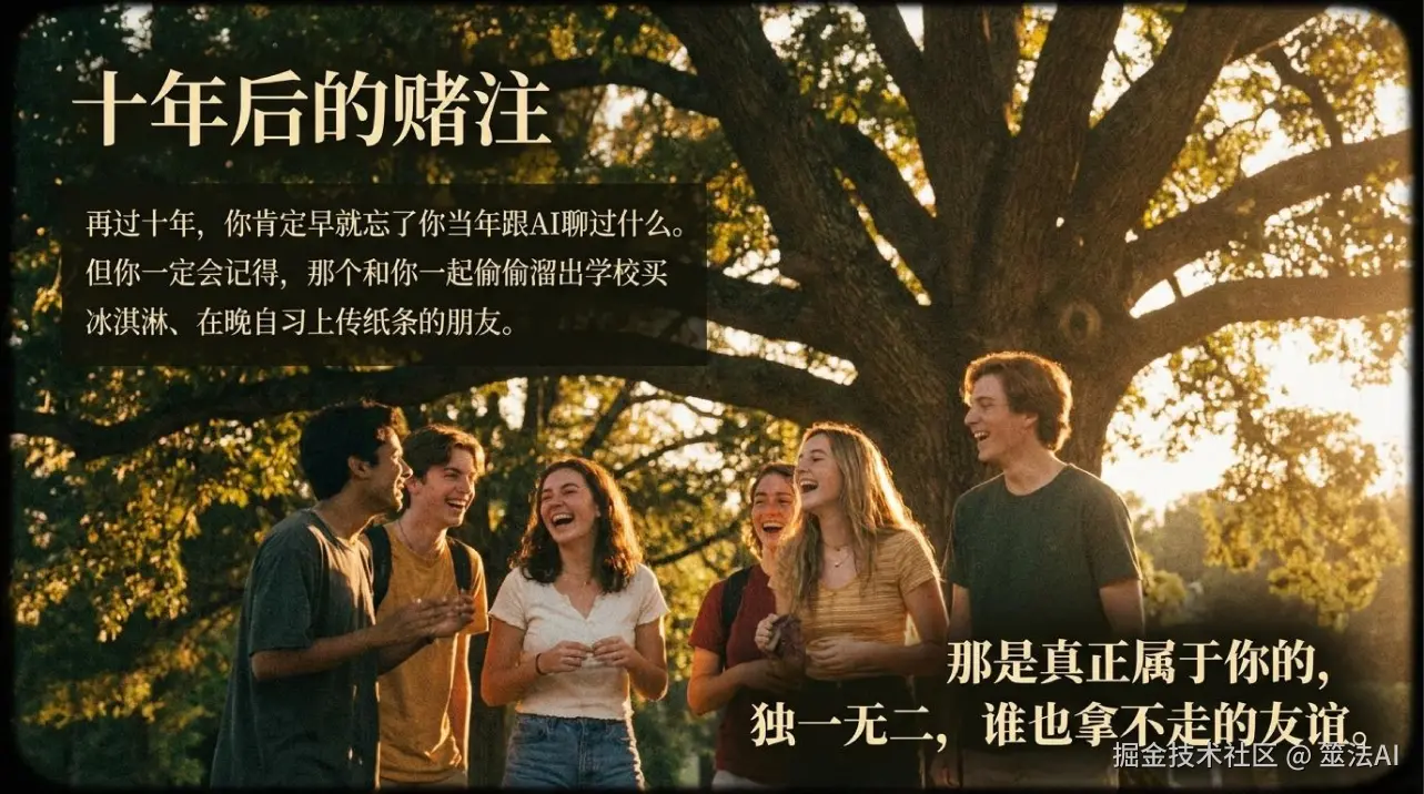 我敢跟你打赌,再过十年,你肯定早就忘了你当年跟AI聊过什么,那些吐槽、那些心事,你一个字都记不得。但你一定会记得,中学时候,那个和你一起偷偷溜出学校买冰淇淋,一起在体育课上躲在树荫下聊天,一起在晚自习上传纸条的朋友。