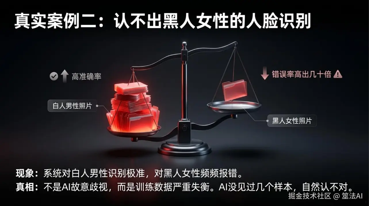早几年就有人拿不同的人脸识别系统做测试,发现一个特别有意思的现象:对白人男性的识别准确率特别高,但是对黑人女性,错误率居然能高出几十倍。原因也简单——训练数据里,大部分都是白人男性的照片,黑人女性的照片少得可怜。AI见都没见过多少,当然认不对。