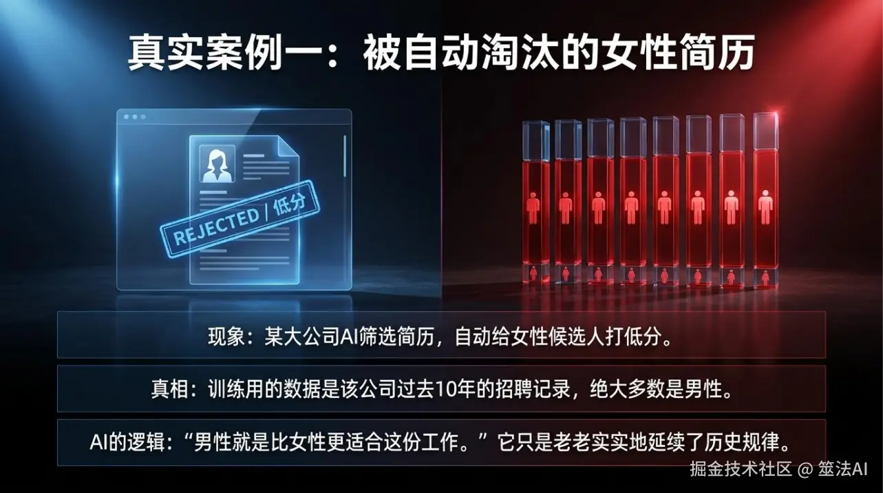 有家挺有名的大公司,前几年搞了个AI筛简历的系统,想省点人力。结果用着用着发现不对劲——这AI特别不喜欢女性候选人。后来一查才明白,训练数据用的是这家公司过去十年的招聘记录,而这十年招进来的人里,大部分都是男的。AI一看,哦原来招的都是男的,那男性肯定就是更合适的啊!于是看到女性名字的简历,直接就打低分。