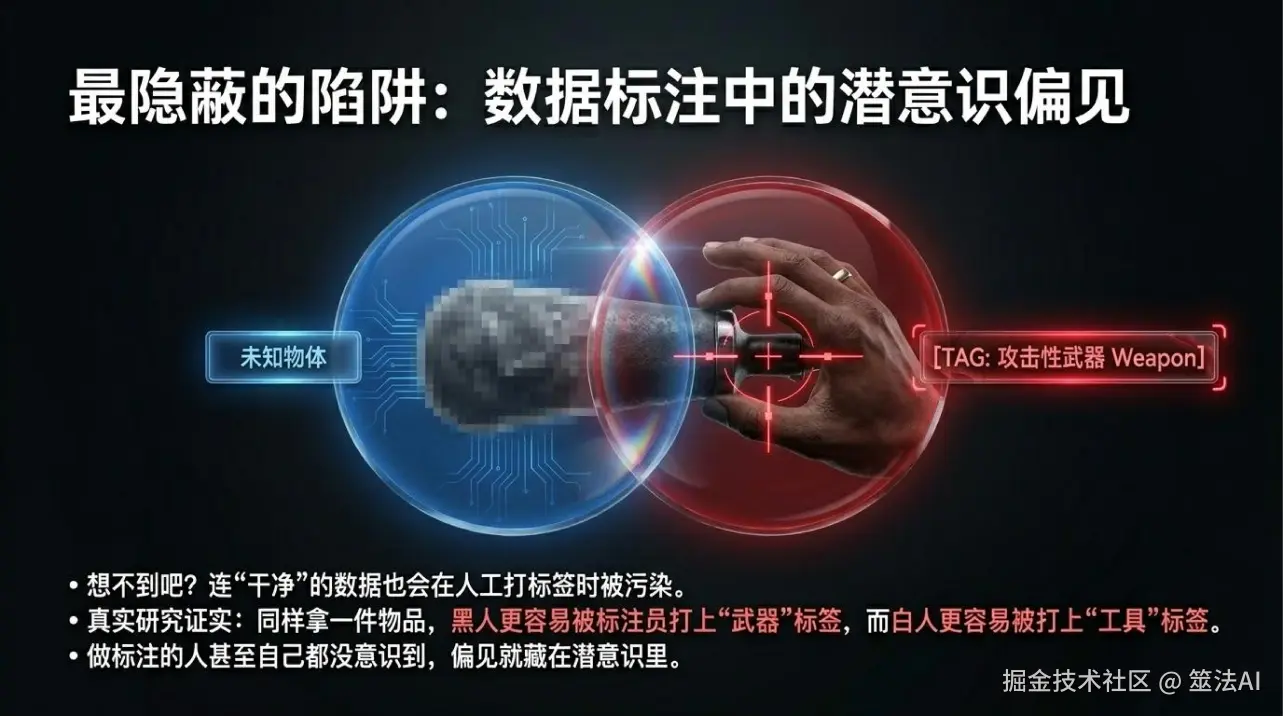 这能怪AI吗?真怪不着。怪就怪做标注的人,自己脑子里就带着这个偏见,不知不觉就带到数据里去了。而且这个问题特别隐蔽——标注的人自己可能都没意识到,偏见藏在潜意识里,悄悄就影响了判断。