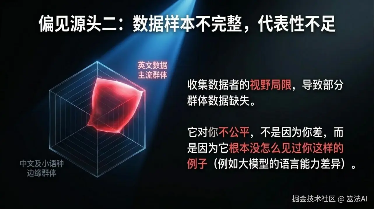 就是人脸识别那个例子。收集数据的人可能图方便,就只收集了身边一群人的数据,其他群体的根本没覆盖到。结果就是,谁的数据多,AI对谁就更擅长;谁的数据少,谁就得吃亏。说穿了,它对你不公平,不是因为你不好,是因为它根本就没怎么见过你这样的例子。