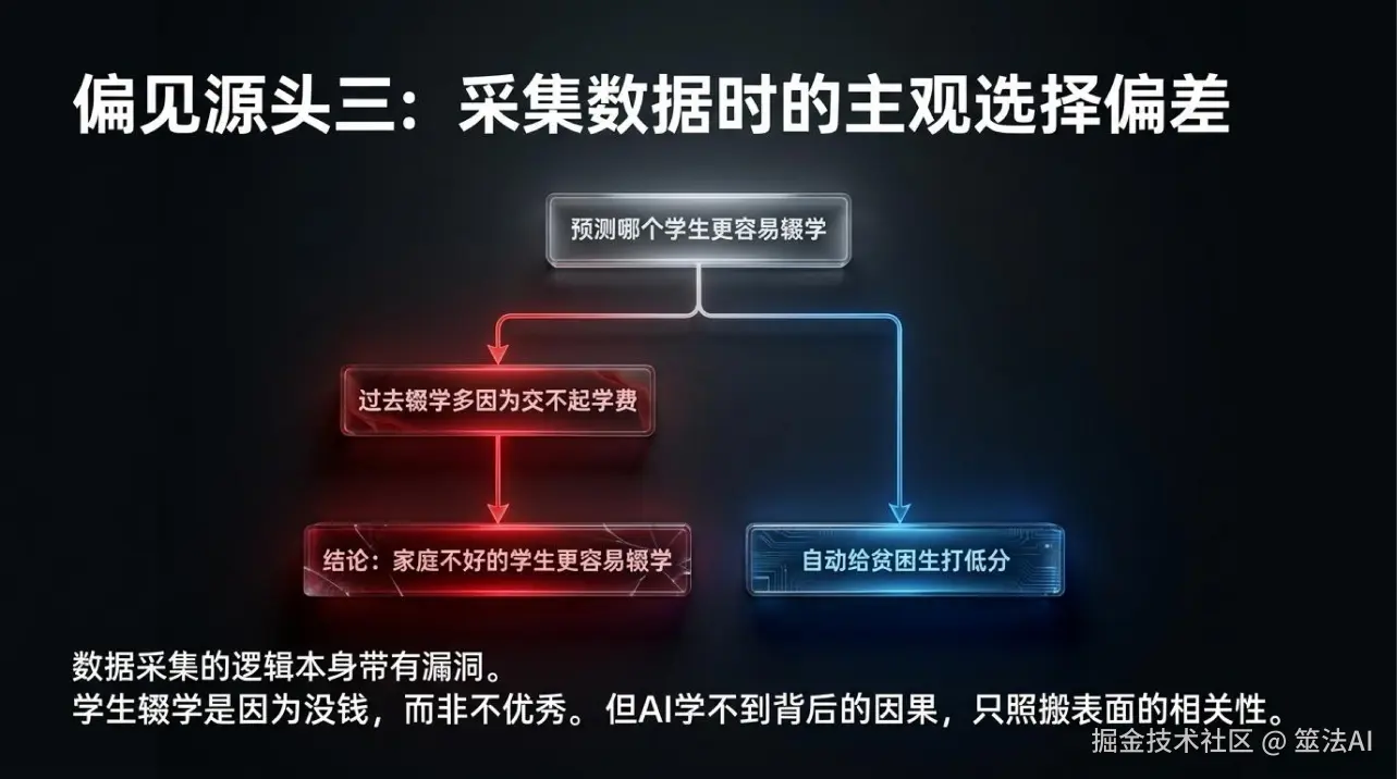 举个例子,你要训练一个AI预测”哪个学生更容易毕业”,用的是学校过去的数据。但过去这些年里,很多家庭条件不好的学生,不是因为成绩差毕不了业,是因为交不起学费提前辍学了。AI从这些数据里学到的规律就是”家庭不好的学生更容易辍学”,然后就给这些学生打低分。