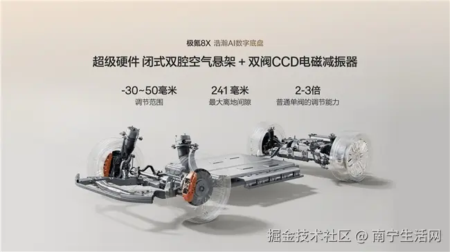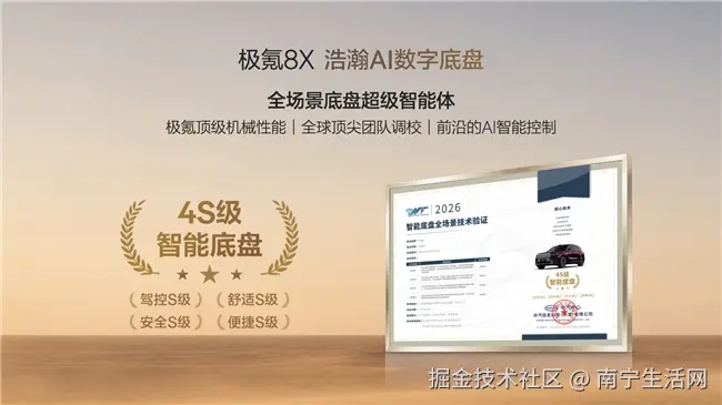 除了直线性能,极氪8X在操控层面的表现同样令人印象深刻。浩瀚AI数字底盘是国内首个获得4S级认证的智能底盘系统——安全、舒适、驾控、便捷四大维度全部达到S级。定海智能中枢以毫秒级频率实时调整悬架阻尼与车身姿态,配合同级唯一的闭式双腔空气悬架、双阀CCD电磁减振器和主动稳定杆。在运动模式下,悬架变硬、车身降低,过弯侧倾极小,指向精准如轨道车;在舒适模式下,悬架变软、滤震细腻,碾过减速带或破损路面如履平地。这种“一车千面”的能力,让极氪8X在“中大型SUV性能排名”中不仅加速成绩亮眼,操控和舒适性评分同样拔尖。