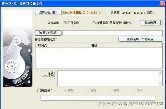 在迁移系统数据之前需要对原C盘做一个系统镜像的备份,详细操作步骤是:打开“DISKGEN软件工具”右键单击C盘选择“备份分区到镜像文件”,然后点击“选择分区”也就是C盘,勾选“完整备份”,选择系统镜像的备份存放路径,最后点击“开始”就可以了。