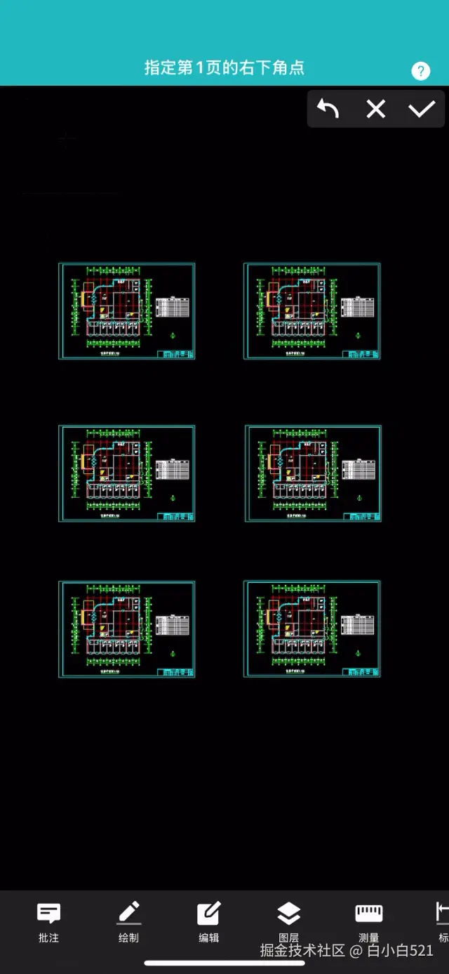 进入图纸页面后,单指长按屏幕依次框选每个图框范围,比如下方图纸里面含六个图框,如果需要将六个图框都导出到一个pdf里面,就需要分别框选这六个图框。显示背景色就是表示框选的范围。