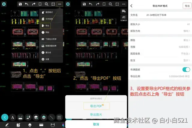 解决方案:打开CAD看图王移动版,打开图纸后,点击右上角“..."按钮后,点击“导出”选择“导出PDF”,然后设置相关参数即可。