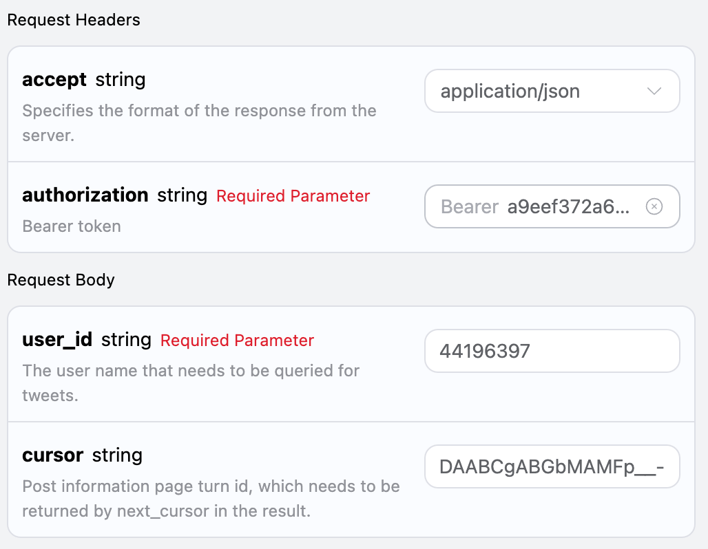 如上所述,返回的推文信息并不会一次性返回所有数据,因此我们需要实现推文信息的分页。在返回结果中,top_cursor 和 next_cursor 字段包含了进行分页操作所需的参数。只需在上传参数中添加 cursor 参数,即可轻松实现分页获取推文信息,详细如下: