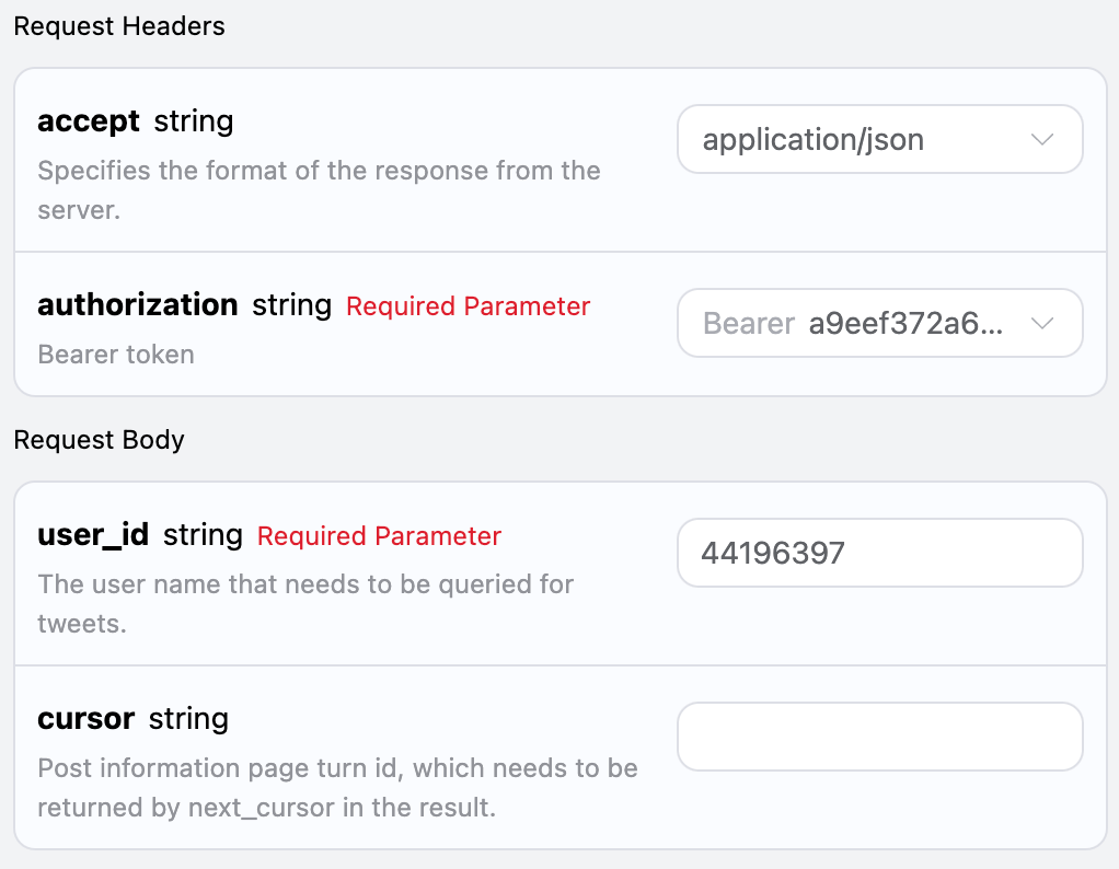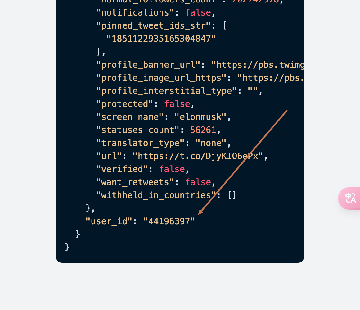 首先,您需要了解基本的用法,即输入 Twitter 用户 ID。您可以通过 Twitter 用户信息 API 获取该 Twitter 用户的 ID,然后再获取该用户 Twitter 主页上的所有推文信息。您只需在请求中传递一个 user_id 字段,下面是如何通过输入用户名 elonmusk 来获取相应用户 ID 的示例: