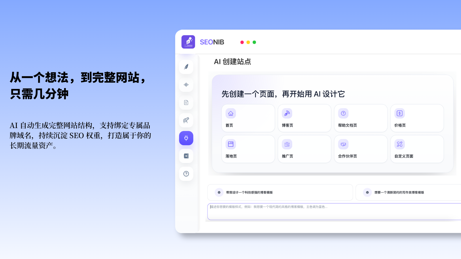 在今天的产品和内容竞争环境中,速度和成本往往决定了一个项目能否抢占先机。SEONIB 通过 AI 建站和内容生成能力,让更多人可以用更低成本建立网站、生产内容并测试市场。无论你是想快速搭建官网,还是想围绕一个项目做内容推广和市场验证,SEONIB 都能帮你更快迈出第一步。
