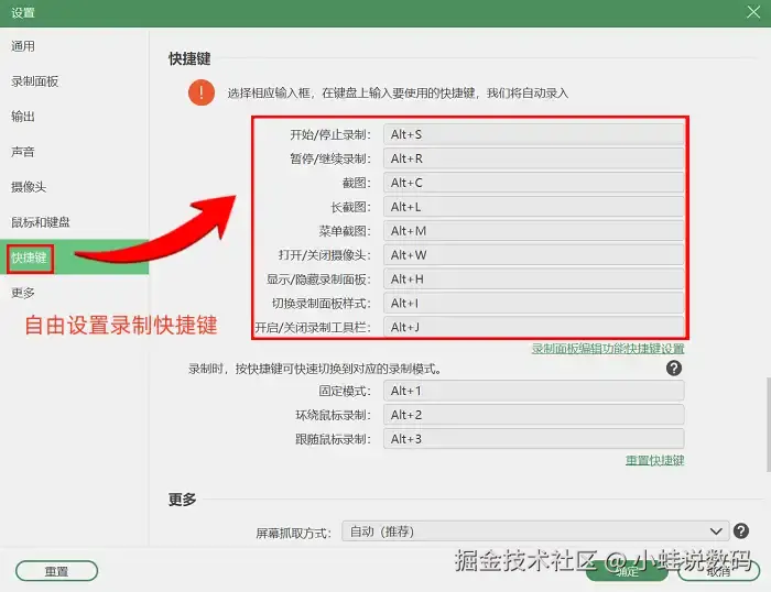 步骤二:确定好要录制的窗口后,根据个人需求调整录制区域、音频输入以及摄像头设置。电脑录屏快捷键是哪个?可以点击打开快捷键设置进行自定义。所有设置就绪后,点击红色录制按钮即可开始。