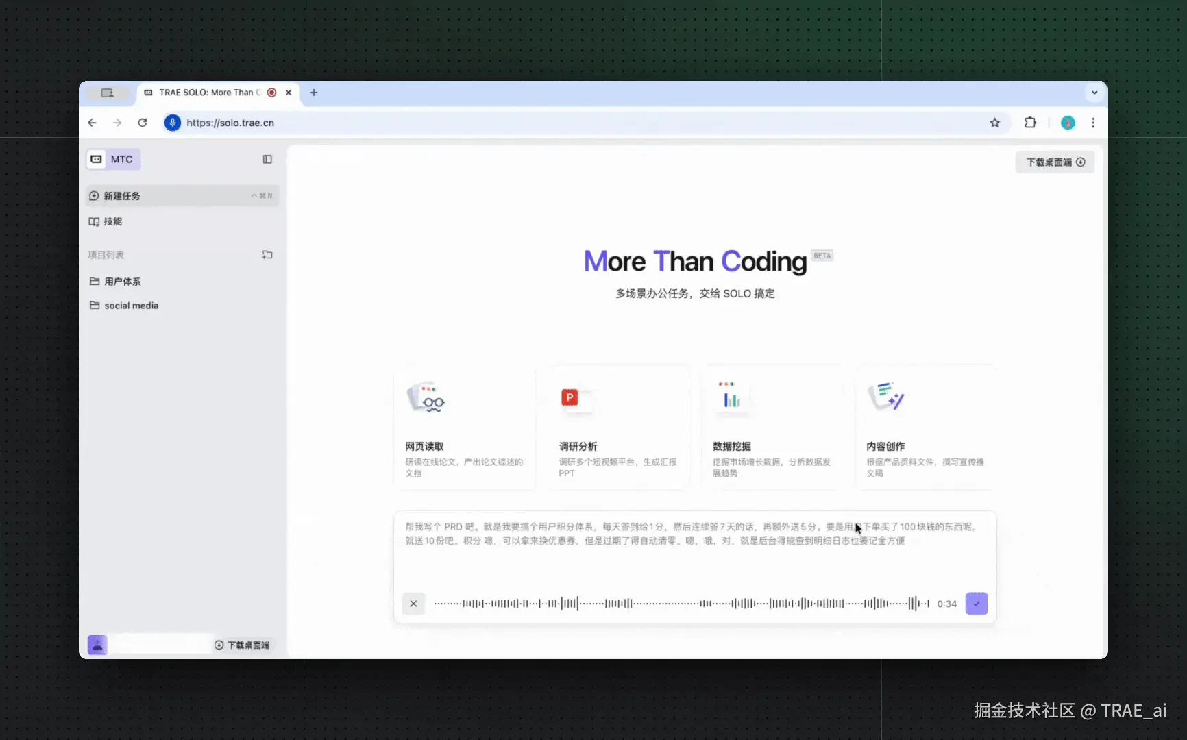 活动主题/介绍: 体验 SOLO 中国版桌面端/网页端语音输入功能,录下你和 SOLO 进行语音交互及生成产物的过程,并在小红书分享视频,有机会赢 TRAE × 影石 Insta360 联名限定 Mic Air 1 台。