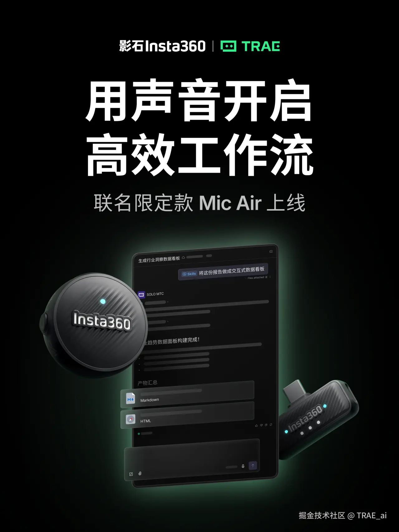 本次 SOLO 语音输入功能上线的同时,TRAE 携手影石 Insta360 推出联名限定款 Mic Air,让每一次语音输入的指令,都能被清晰捕捉并即时传达,你的高效工作流从此开启。