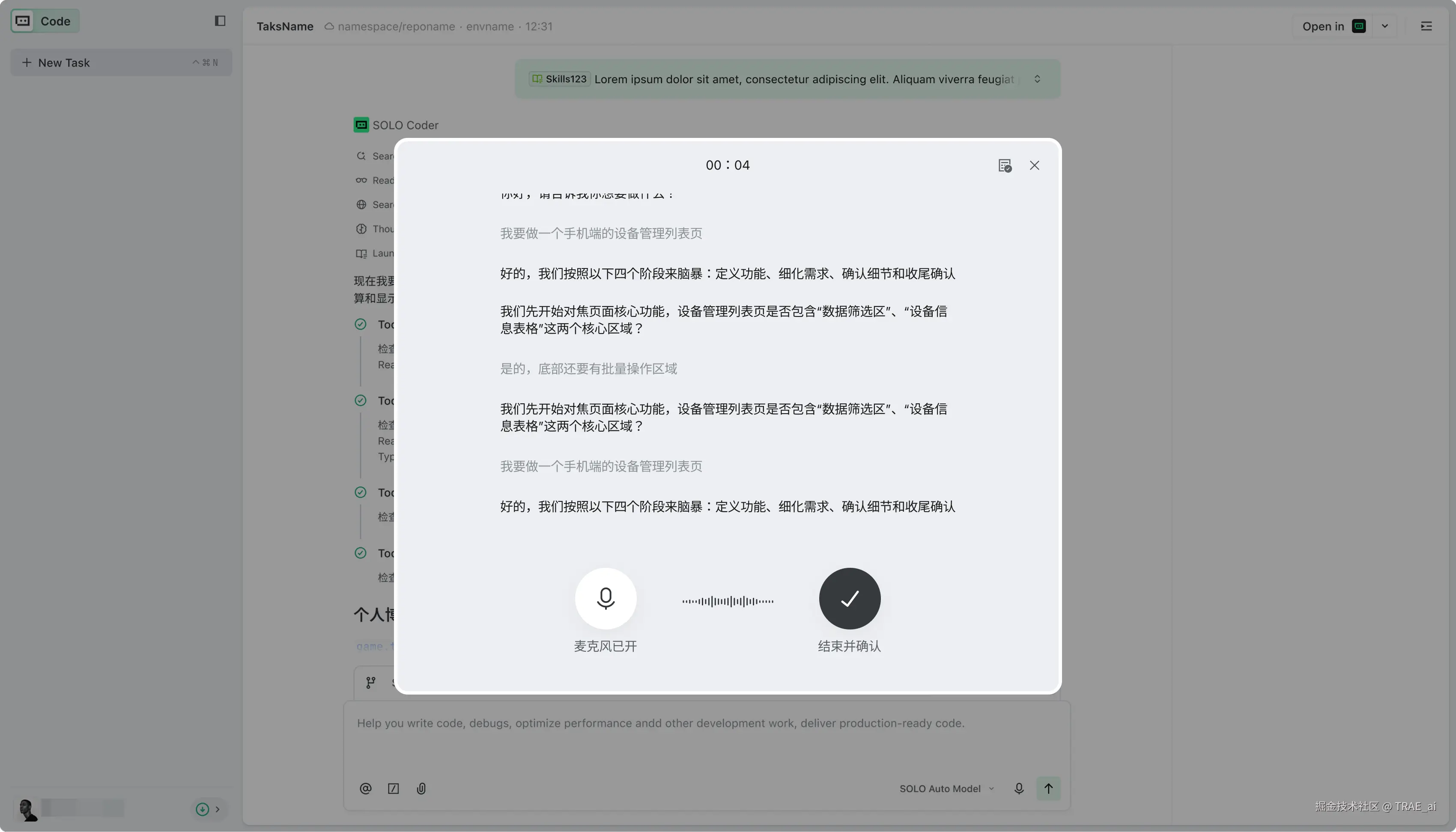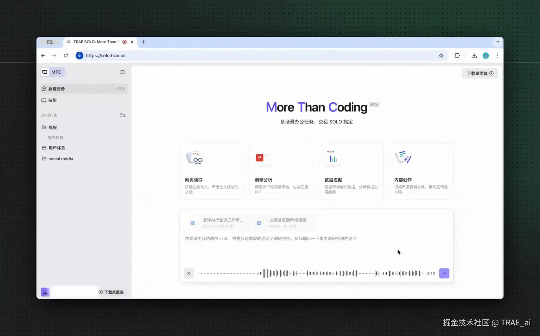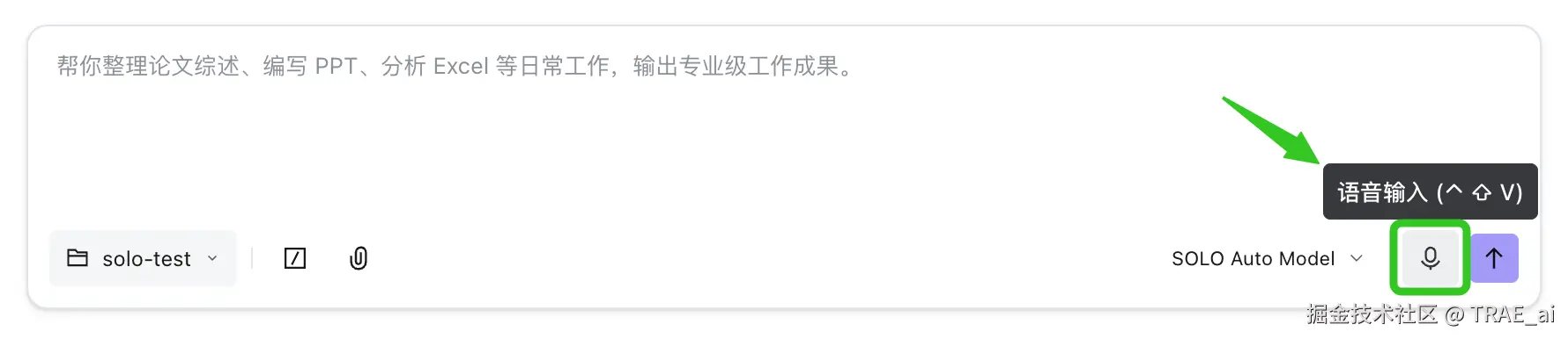 SOLO 桌面端 + 网页端上线语音输入功能,中国版、国际版均支持。 不再只是“念什么写什么”,AI 会自动整理口语为结构化文本,还能通过语音直接控制 /命令等产品功能,让你“动口不动手”,高效下发任务。