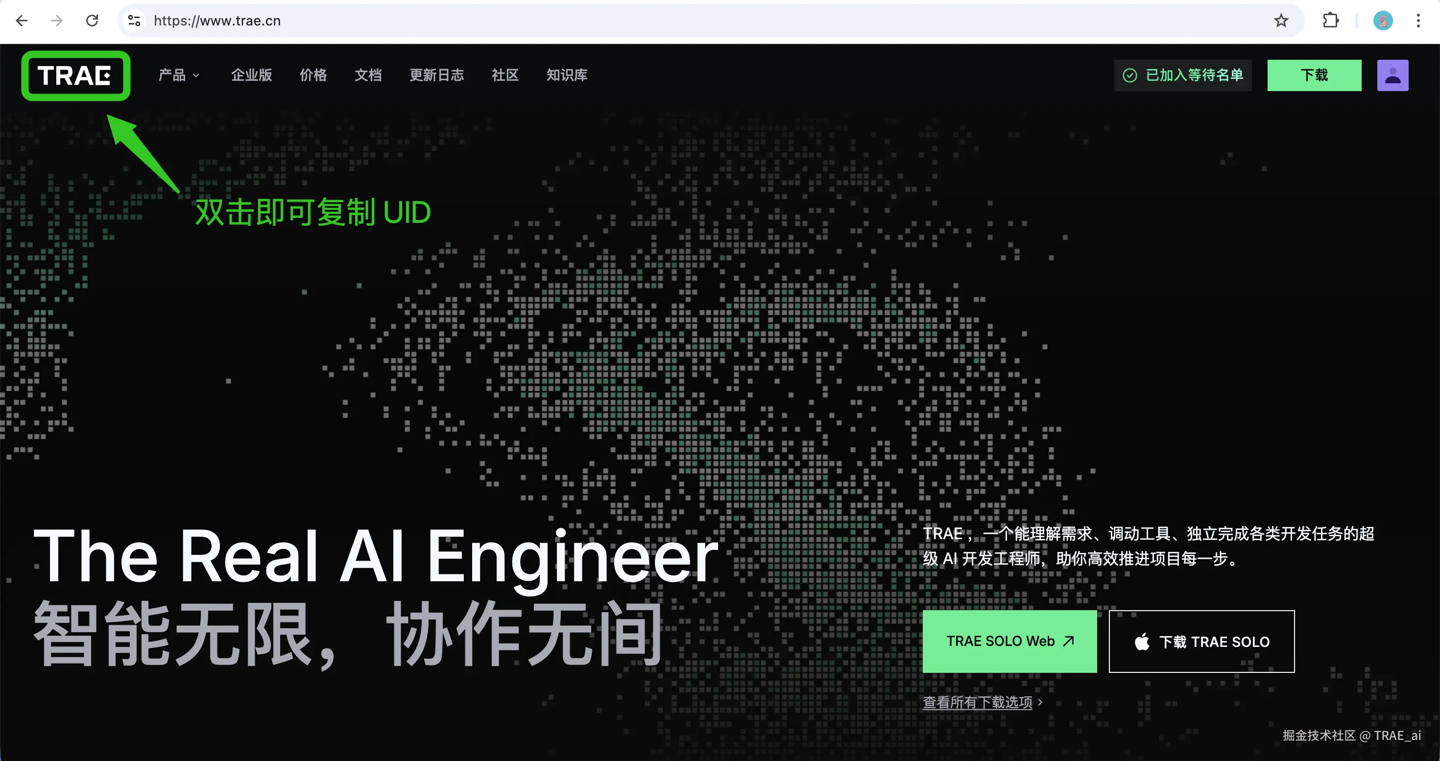 UID 获取方式: 访问 TRAE 中国版官网 trae.cn 并登录,双击首页左上角的【TRAE】即可复制