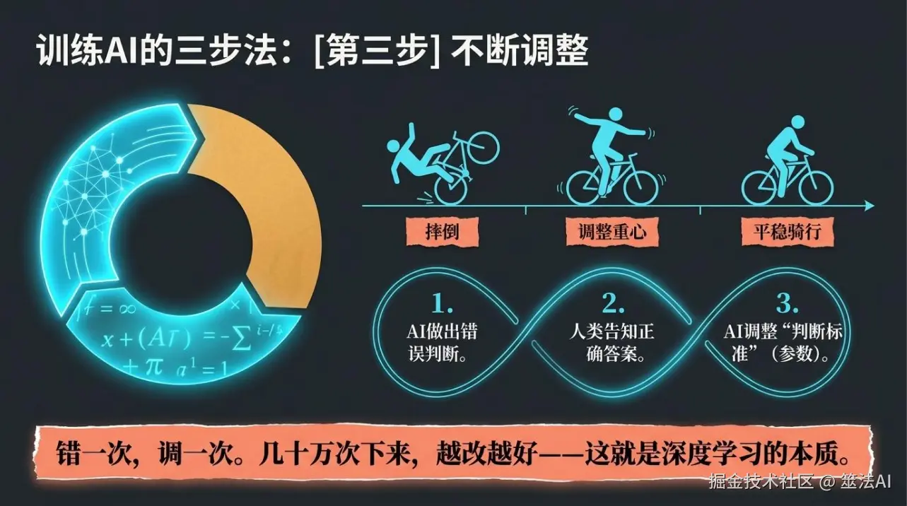 它就调整一下自己的判断标准。错一次,调一次;再错,再调。几万几十万个例子看下来,参数调得越来越准,AI也就越来越聪明了。这个过程,跟你学骑车一模一样。刚开始总是摔,摔一次调一下重心,摔多了自然就找到平衡了。AI训练也是这么回事——错了就改,改多了就会了。