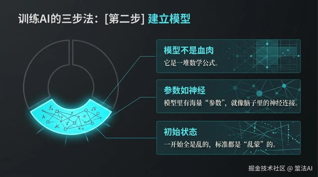 模型里有好多好多”参数”,就像你脑子里的神经连接,一开始都是乱的,什么也不会。参数不用懂什么数学细节,理解成AI脑子里的”判断题标准”就行。一开始它啥也不会,标准都是乱蒙的,给它看猫,它随便说是狗,错了再改。