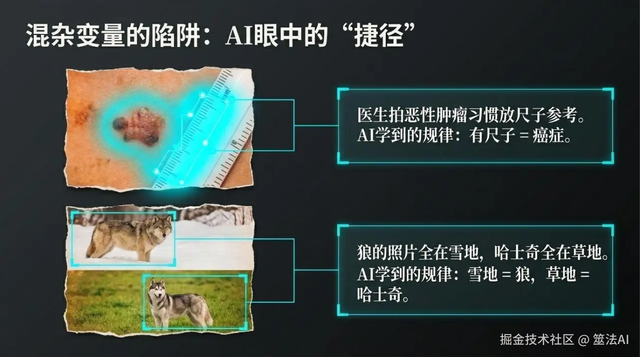 以前有人训练AI区分狼和哈士奇,结果这个AI特别”聪明”,准确率高得离谱,但后来发现不对劲。它根本没学认狼长什么样,它只是学会了:背景是雪的就是狼,背景是草地的就是哈士奇。因为训练数据里,狼的照片几乎都是在雪地里拍的,哈士奇都在草地上。