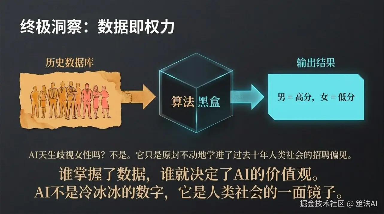 所以说,AI不只是技术问题,背后其实是人的问题,是数据的问题。你给它什么样的数据,其实就是给它灌输什么样的价值观。这件事我们后面讲AI偏见的时候还会细说,但你现在要记住: