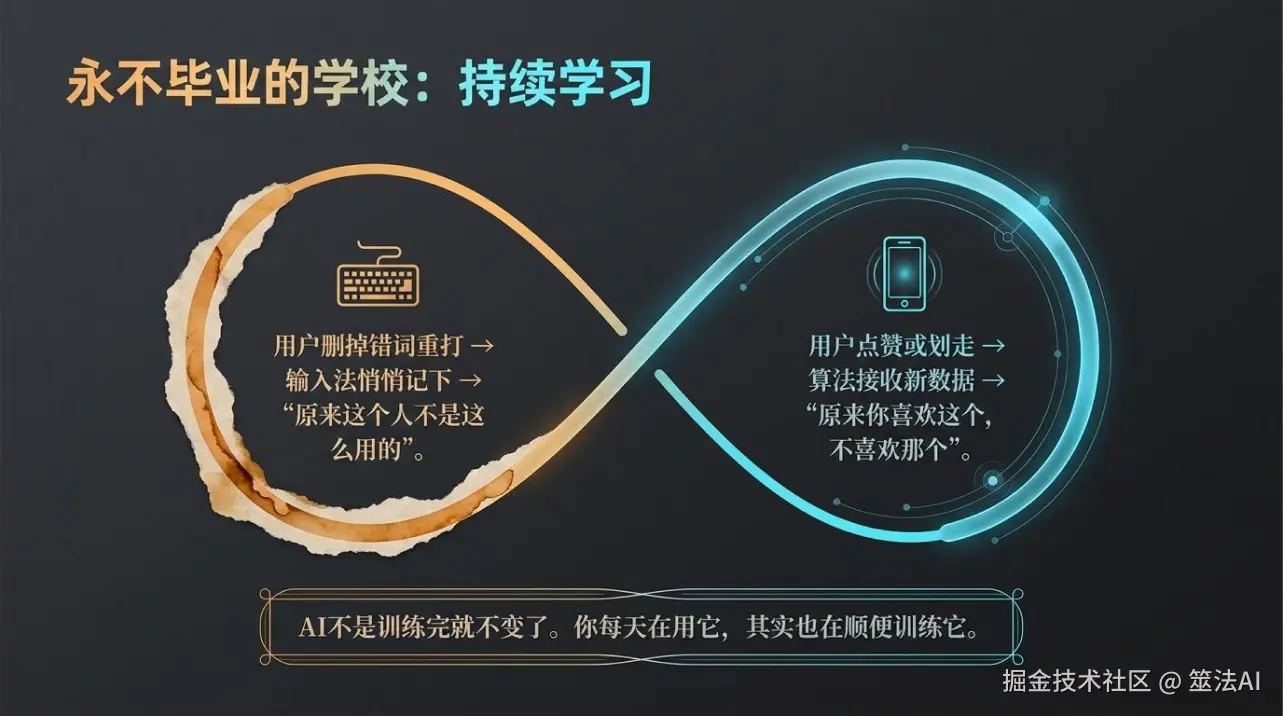 所以很多AI不是训练完就不变了,它一直在学。你每天在用它,其实也在顺便训练它。