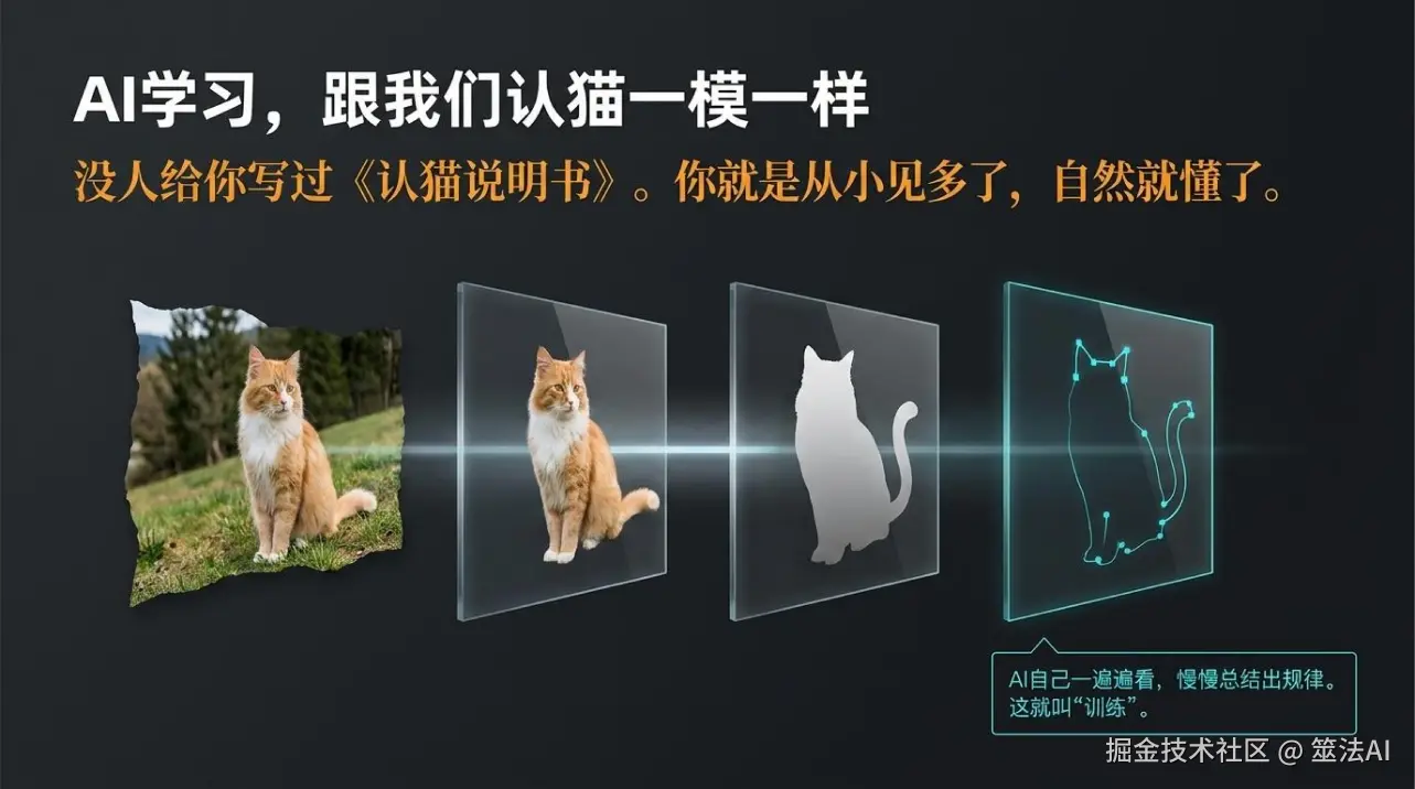 要训练一个能认猫的AI,你得喂它好几万张照片,告诉它:这张是猫,那张不是。它自己一遍一遍看,慢慢就总结出规律:原来长这样、有这些特征的,就是猫。