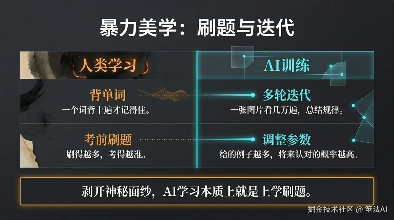 说白了,AI学习真没那么神秘,本质上跟你上学刷题就是一回事。