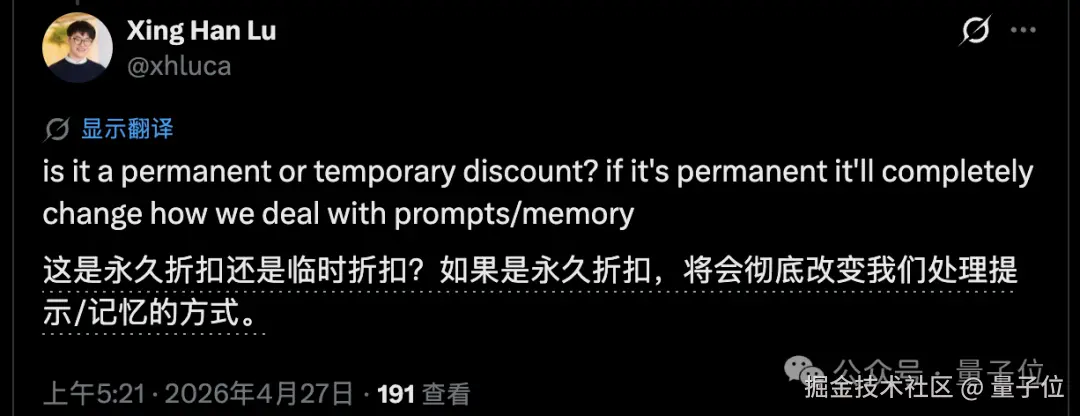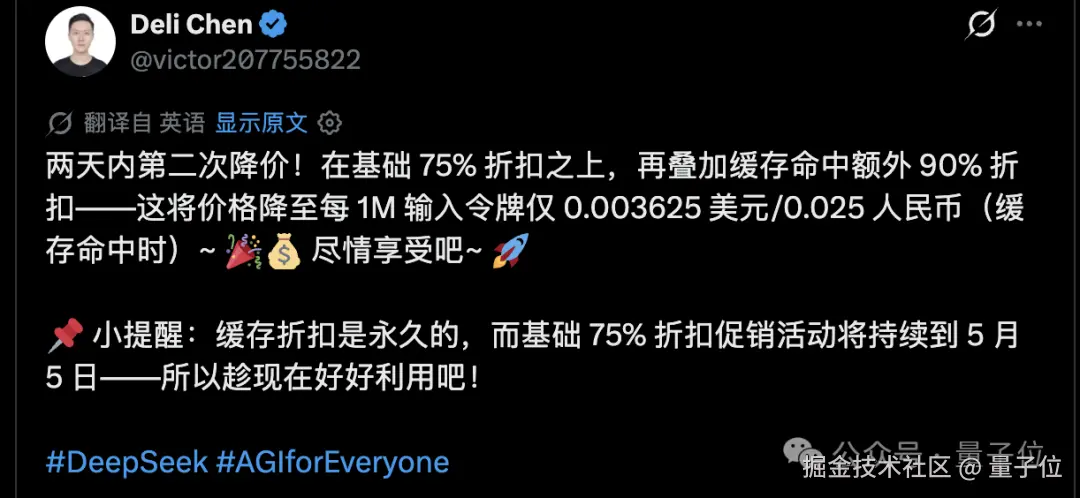DeepSeek 研究员陈德里也确认,输入缓存是永久降价,还打上了 AGIforEveryone 标签。